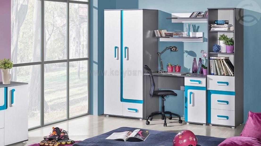 Nábytek je vyroben z kvalitní LTD desky hraněné ABS lištou. Korpus je v barvě šedá antracit, dvířka a čela zásuvek jsou bílé matné, Doplňkové barvy můžete vybírat: tyrkys, růžová, antracitová nebo dub jasný, který již není kombinován s antracitovým korpusem. Úchytky jsou v barevné kombinaci podle vybrané doplňkové barvy.
