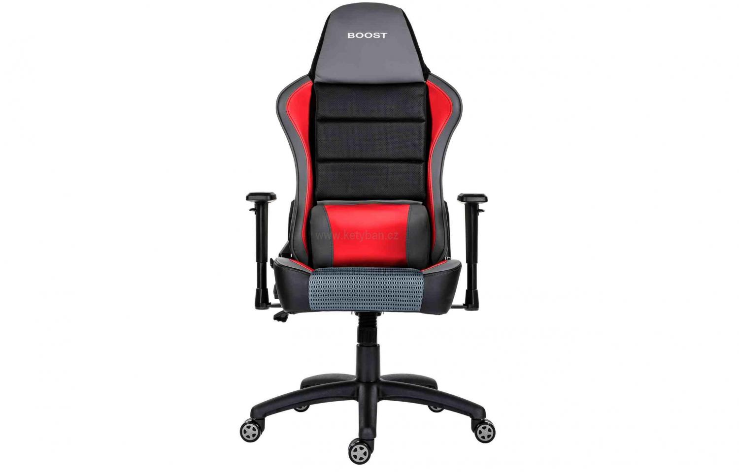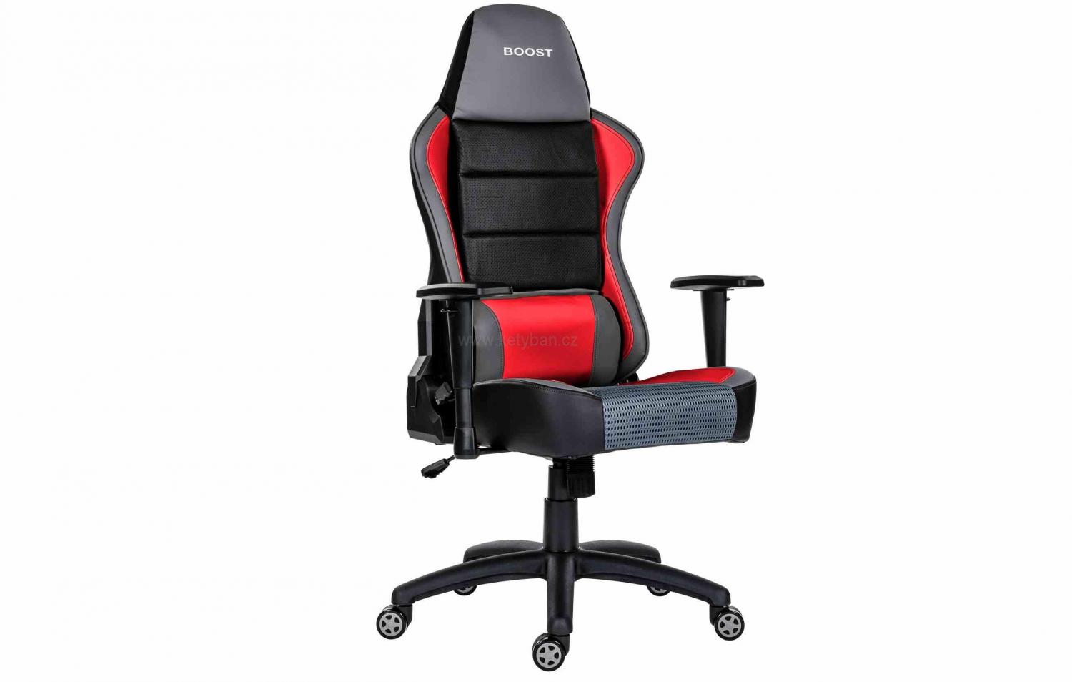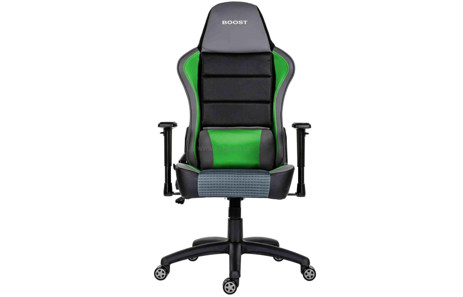Herní židle Boost pro vyšší komfort se sítí na opěradle a prodyšnou potahovou látkou na sedáku. Snímatelný podhlavník a polštářek s úponem vytváří možnost individuální úpravy tvaru čalounění opěradla.