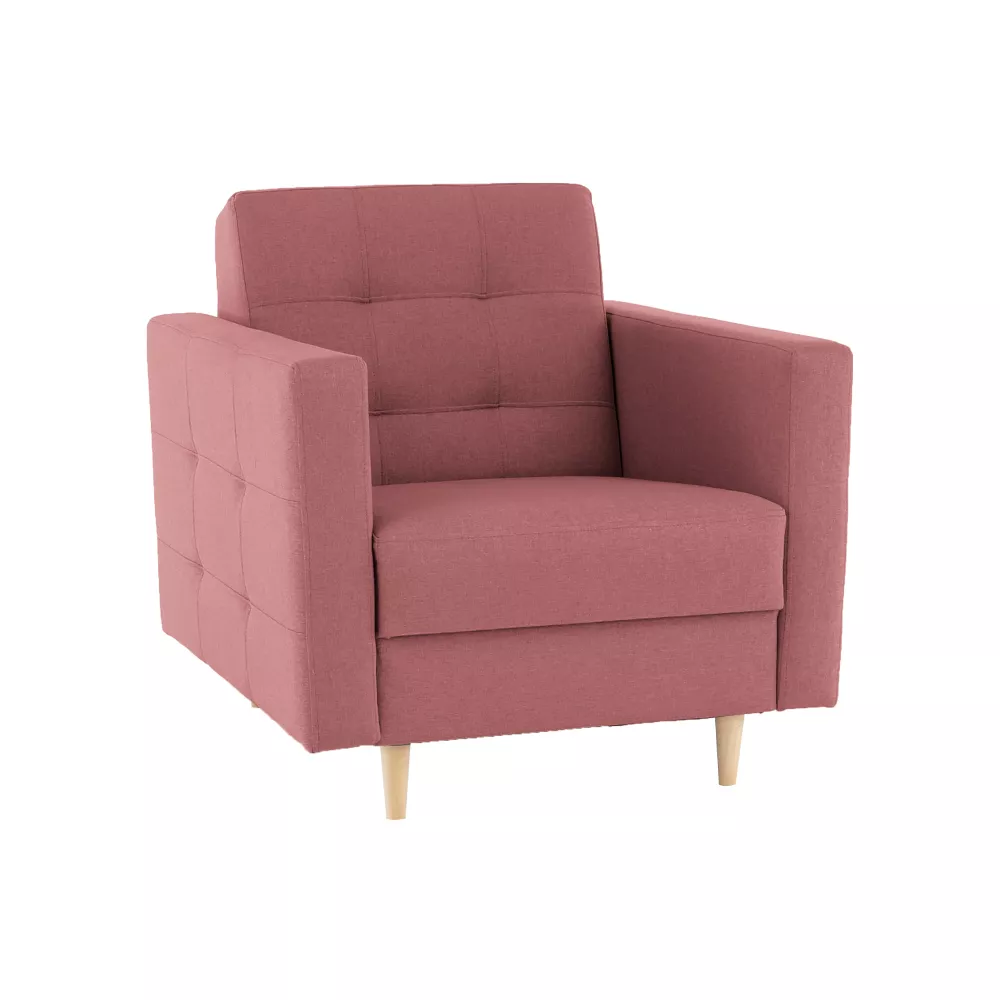 Křeslo stojí na pevných dřevěných nožičkách. Dekorativní prošití opěradla a vnějších stran opěrek na ruce dodává křeslu šmrc. Výplň sedací části z bonelové pružiny zajistí komfort.