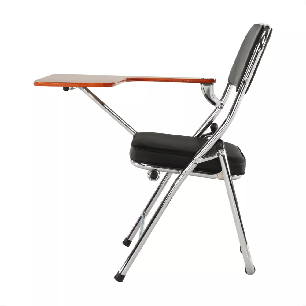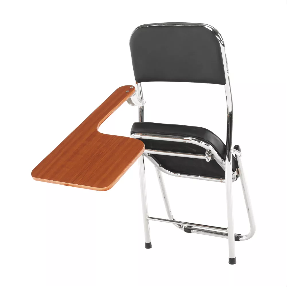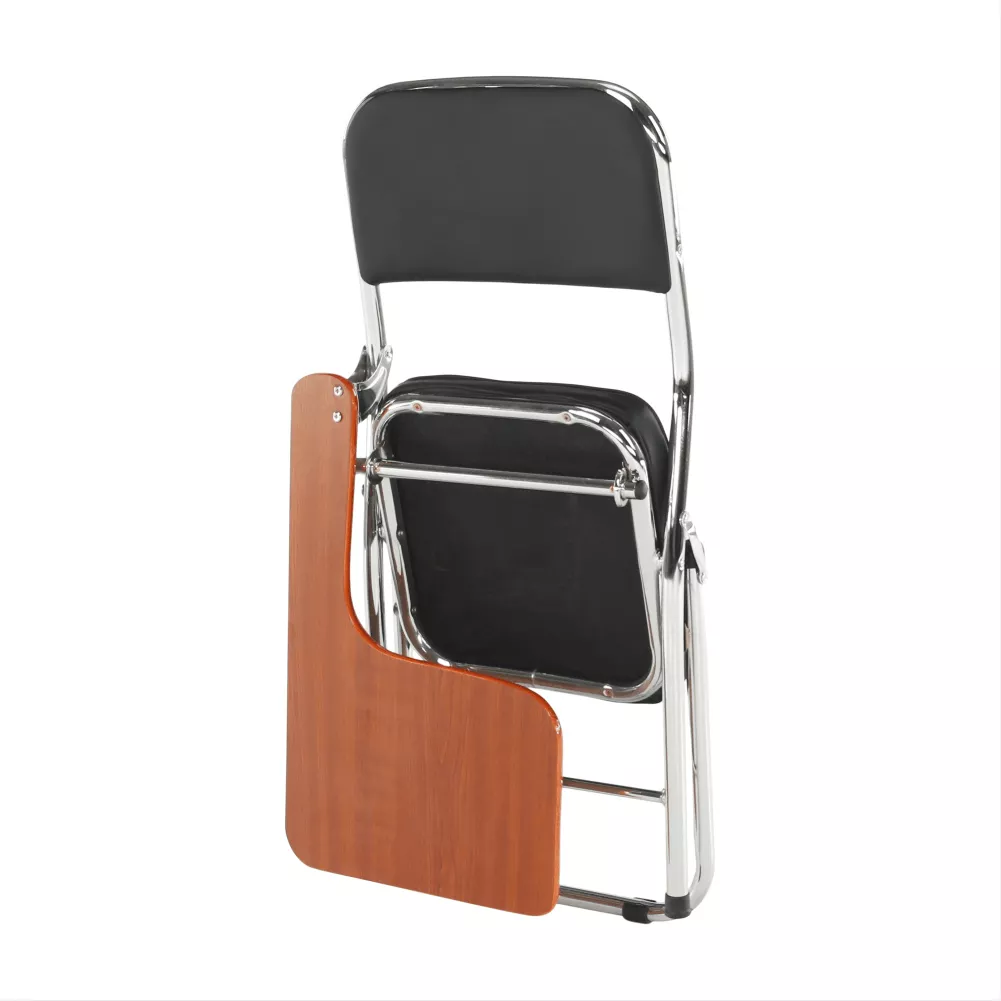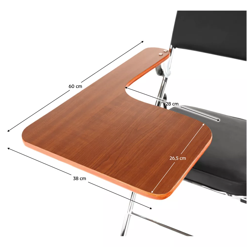Tato vydařená stolička je čalouněná černou ekokůží a její účel je poskytnout maximální komfort při sezení i na několikahodinové přednášce. Její multifunkčnost lze spatřit i v tom, že ty nejdůležitější poznámky zůstanou zapsány nejen v hlavě, ale také na papíře. Pro tyto účely je zde dřevěná deska v přírodní barvě, která je montážně připevněna ke stoličce a zároveň tak plní funkci stolu.