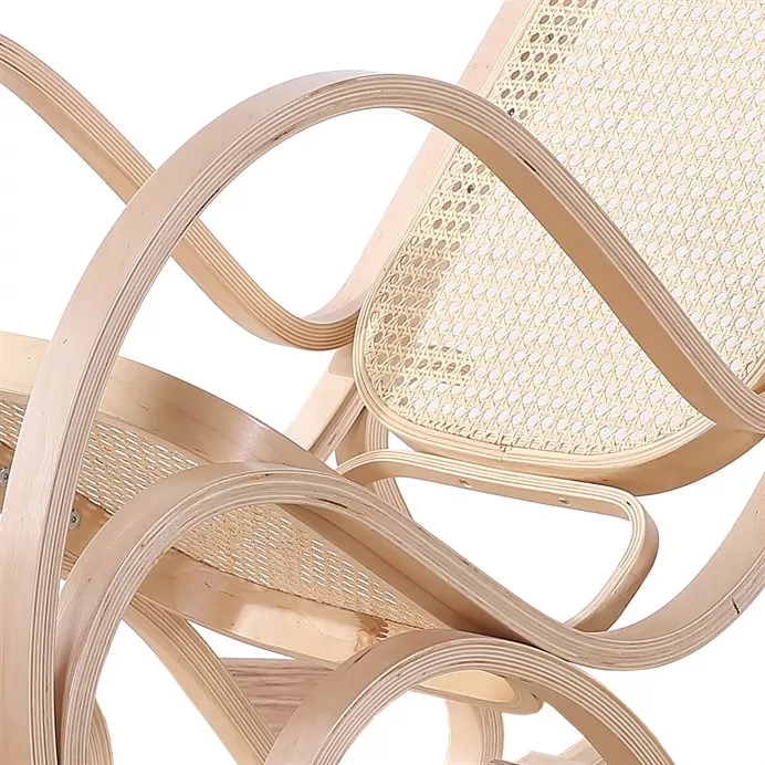 Křeslo je vyrobeno z ohýbané bukové překližky v přírodním odstínu a lakováno transparentním lakem. Výplet sedáku i opěráku je z pravého ratanu, také v přírodním odstínu.