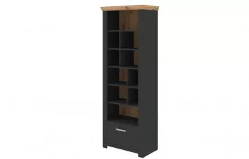 Regál je vybaven systematicky a designově rozmístěnými nikami a prostornou spodní zásuvkou.