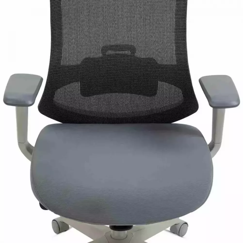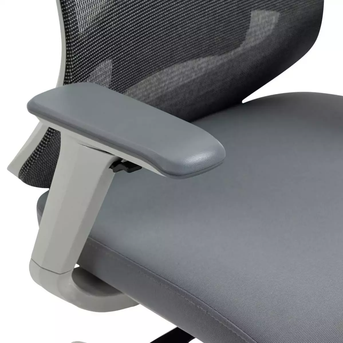 Design a materiály: Tato kancelářská židle je vyrobena s vysokým opěrákem a čalouněným v prodyšném materiálu MESH, který zajišťuje optimální cirkulaci vzduchu a pohodlí během dlouhých pracovních dnů. Sedák židle je potažen šedou látkou pro větší pohodlí.