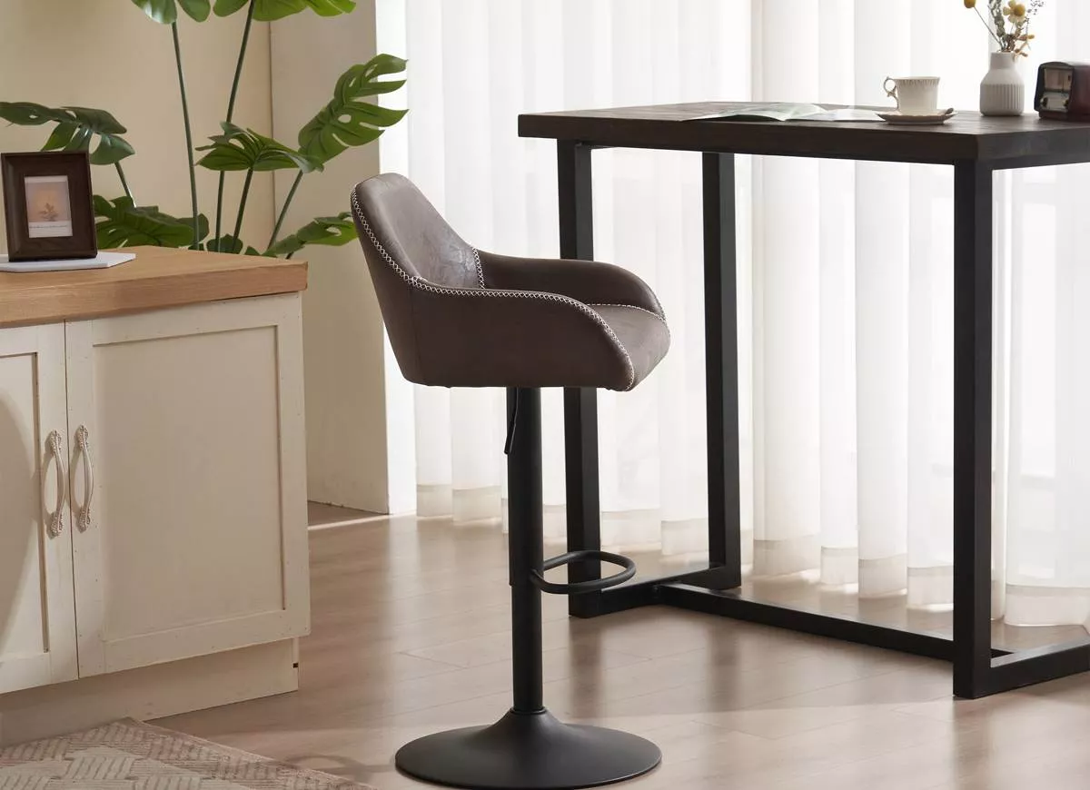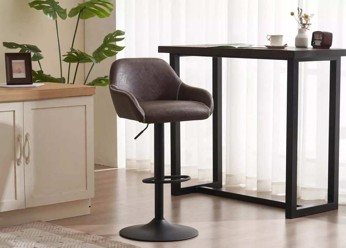 Barová židle AUB-716 je pravým synonymem pro eleganci a funkčnost, dokonale kombinující luxusní vzhled s praktičností. Její čalounění z hnědé nebo šedé látky v dekoru vintage kůže poskytuje nadčasový a sofistikovaný vzhled, který se snadno začlení do jakéhokoli prostředí, ať už je to stylový bar, honosná kancelář nebo domácí prostor.