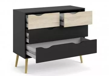 Komoda je vyrobena z odolného a snadno udržovatelného laminátu o tloušťce 15 mm, což z ní činí funkční a trvanlivý nábytek. Je vybavena dostatečným úložným prostorem, který vám umožní udržet pořádek a organizaci ve vašem domě. Retro vzhled komody je zdůrazněn vysokými šikmými nožkami a obloukovými výřezy místo tradičních úchytek.
