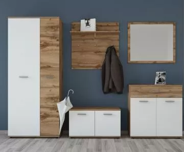 Sektorová sestava IRIA představuje elegantní řešení pro vaši předsíň, spojující dostatek úložného prostoru se stylem a elegancí. Nábytek je vyroben z laminované dřevotřískové desky, doplněné o ozdobné lišty z ABS. Stříbrné plastové úchytky dodávají sestavě moderní vzhled. Sestava IRIA je k dispozici v bílém/dub sonoma a bílá/dub wotan provedení, což vám umožňuje vytvořit si vlastní kombinaci dle vašich preferencí. Jednotlivé komponenty jsou prodávány samostatně, což vám poskytuje flexibilitu při vytváření interiéru.