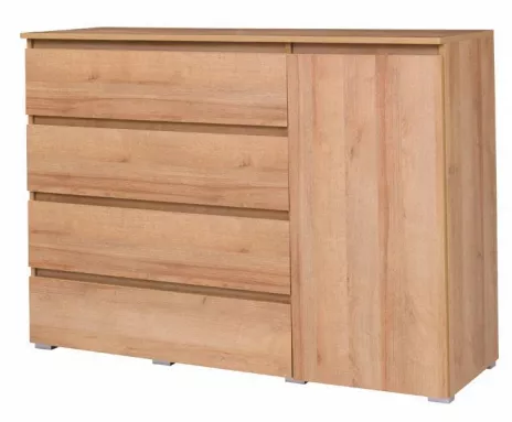 - Prostorný úložný prostor: Komoda disponuje čtyřmi prostornými zásuvkami a skříňkou s dvířky, což zajišťuje dostatek místa pro uložení oblečení, knih, dokumentů nebo dekorací.