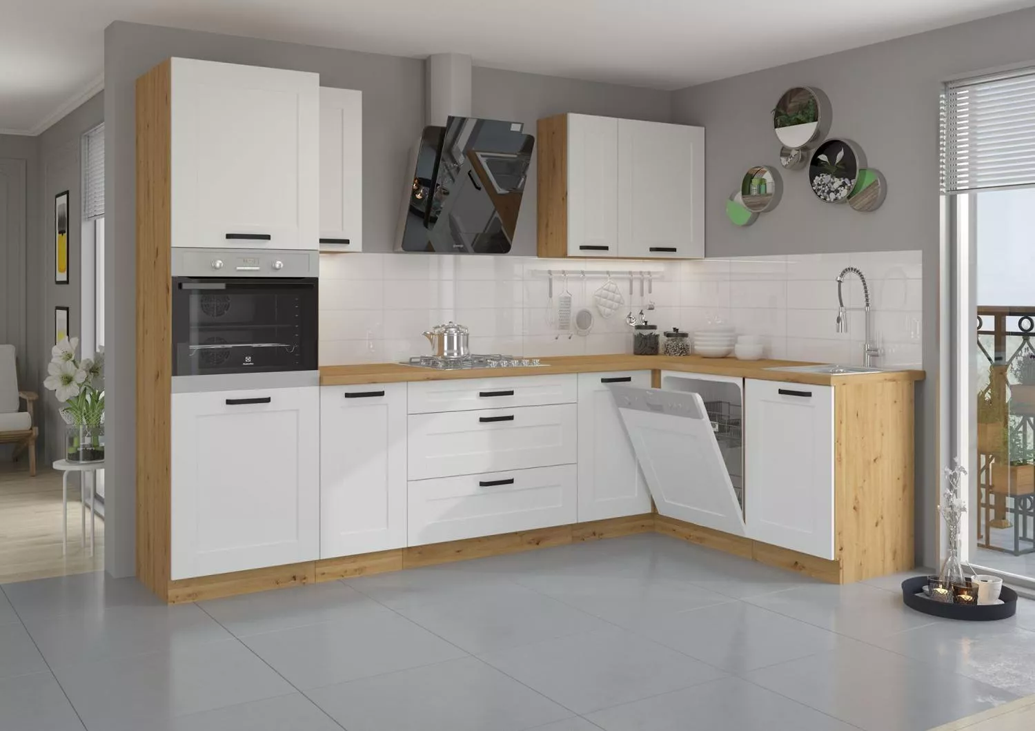 Součástí balení jsou dva sokly ? jeden v bílé barvě, druhý v dekoru dub artisan, což umožňuje přizpůsobení celkovému stylu kuchyně. Dvířka jsou dodávána bez úchytky, což umožňuje individuální výběr podle vašich preferencí.