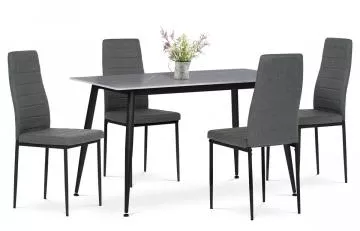 Obdélníkový stůl se slinutou keramickou deskou v šedém mramorovém dekoru zaujme na první pohled svým vytříbeným vzhledem. Keramika je nejen vizuálně atraktivní, ale také velmi odolná vůči poškrábání, teplotě a běžnému opotřebení. Černé kovové nohy ve štíhlém kónickém provedení zajišťují stabilitu a podtrhují industriální charakter celého setu.