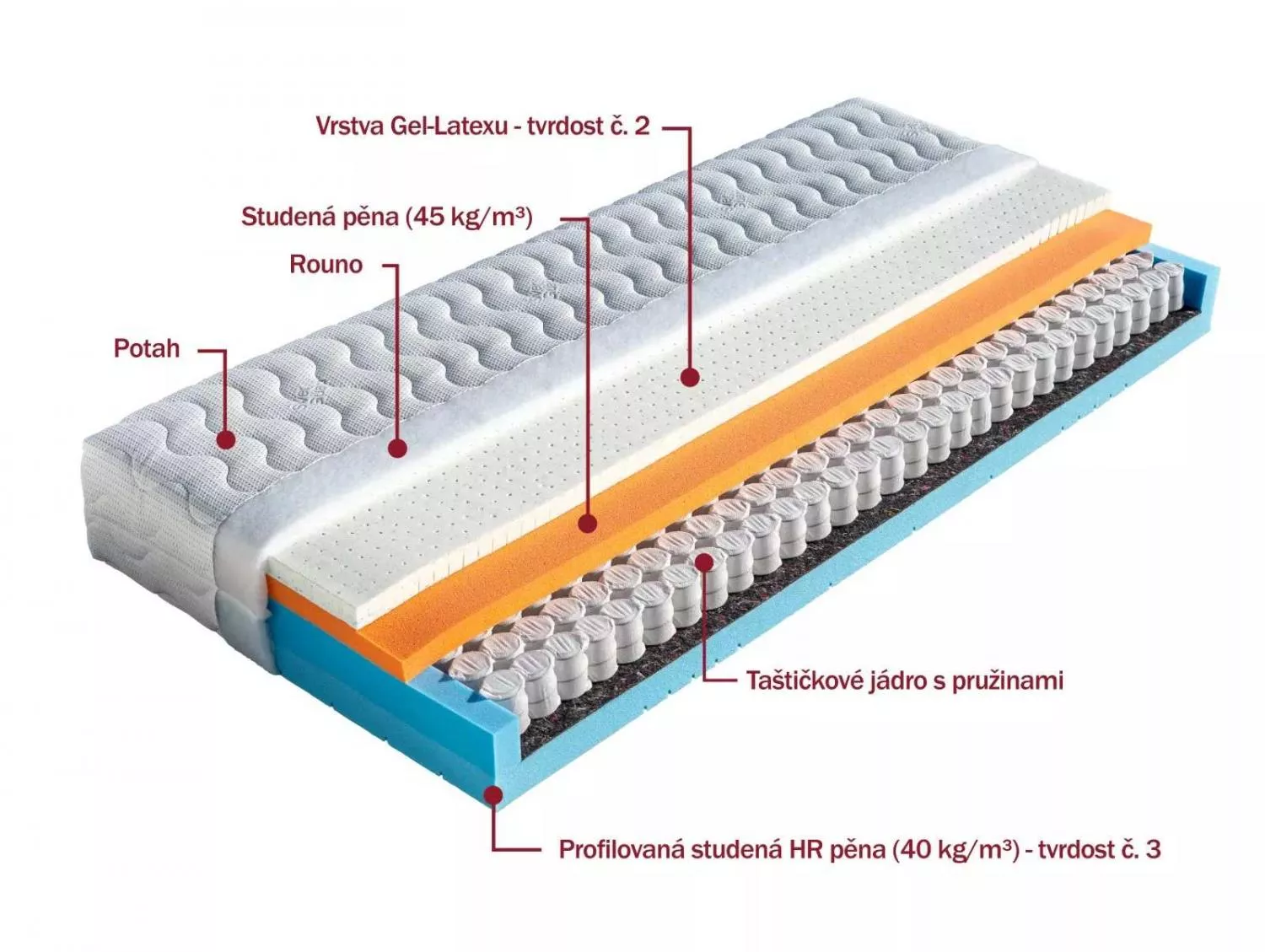 - Materiál jádra: taštičkové pružiny, HR pěna, Gel-Latex