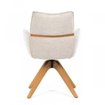 Hladké čalounění a měkká výplň z PU pěny zajišťují komfort i při delším sezení. Dřevěné masivní nohy v přírodní barvě dodávají židli stabilitu a podtrhují její skandinávský styl. Oceníte otočný mechanismus s vratnou funkcí, který přináší větší flexibilitu a pohodlí při každodenním používání. Integrované područky a dřevěné detaily navíc dodávají židli sofistikovaný vzhled. Ideální doplněk do moderní jídelny, kde se propojují styl a funkčnost.