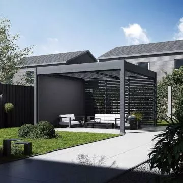 Kteroukoliv stranu pergoly lze doplnit o zástěnu. V nabídce máme čtyřmetrové zástěny s hliníkovou konstrukcí a výplní z textilenu, které poskytnou ochranu před větrem a zároveň vytvoří příjemný stín. Pergolu je také možné doplnit o stínicí panely s fixními či sklápěcími horizontálními lamelami pro dodatečné soukromí a zastínění.