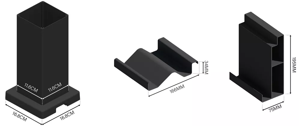 Robustní sloupek má rozměry 116x116 mm, při instalaci je zapotřebí počítat s patkou sloupku o rozměrech 160x160 mm. Patka je z 8 mm silné oceli a je navíc zakryta hliníkovým krytem (165x165 mm) s integrovaným drenážním systémem. Vyvýšený hliníkový profil s přidanou horní lištou ukrývá lamely tak, že z bočního pohledu nejsou viditelné a jsou v jedné linii s profilem.