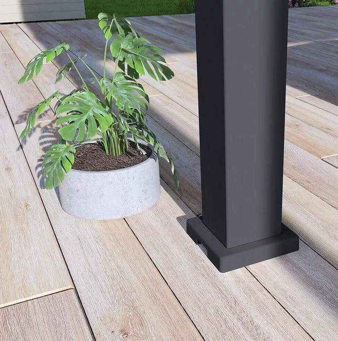 Robustní sloupek má rozměry 116x116 mm, při instalaci je zapotřebí počítat s patkou sloupku o rozměrech 160x160 mm. Patka je z 8 mm silné oceli a je navíc zakryta hliníkovým krytem (165x165 mm) s integrovaným drenážním systémem. Vyvýšený hliníkový profil s přidanou horní lištou ukrývá lamely tak, že z bočního pohledu nejsou viditelné a jsou v jedné linii s profilem.