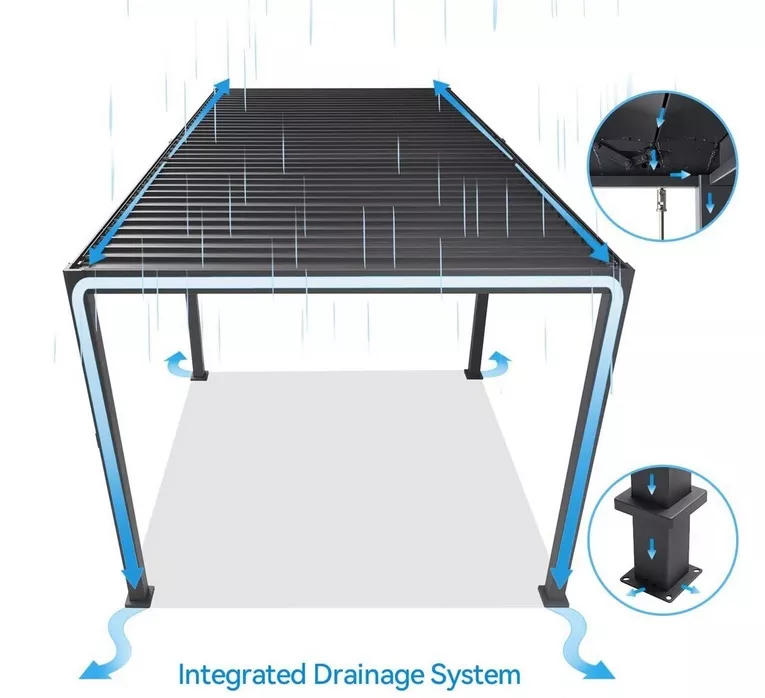 25 nastavitelných otočných lamel Vás ochrání nejen před sluncem, ale i před deštěm. Lamely lze otáčet od 0°, kdy docílíte úplně uzavřené střechy až do 135°, díky čemuž získáte skvělou mobilitu a možnost zastínit slunce z jakékoliv strany.