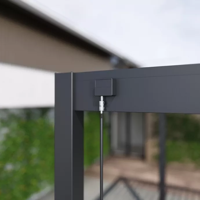 Kteroukoliv stranu pergoly lze doplnit o zástěnu. V nabídce máme třímetrové a čtyřmetrové zástěny s hliníkovou konstrukcí a výplní z textilenu, která poskytne ochranu před větrem. Pergolu je také možné doplnit o stínicí panel s fixními horizontálními lamelami pro dodatečné soukromí a zastínění.