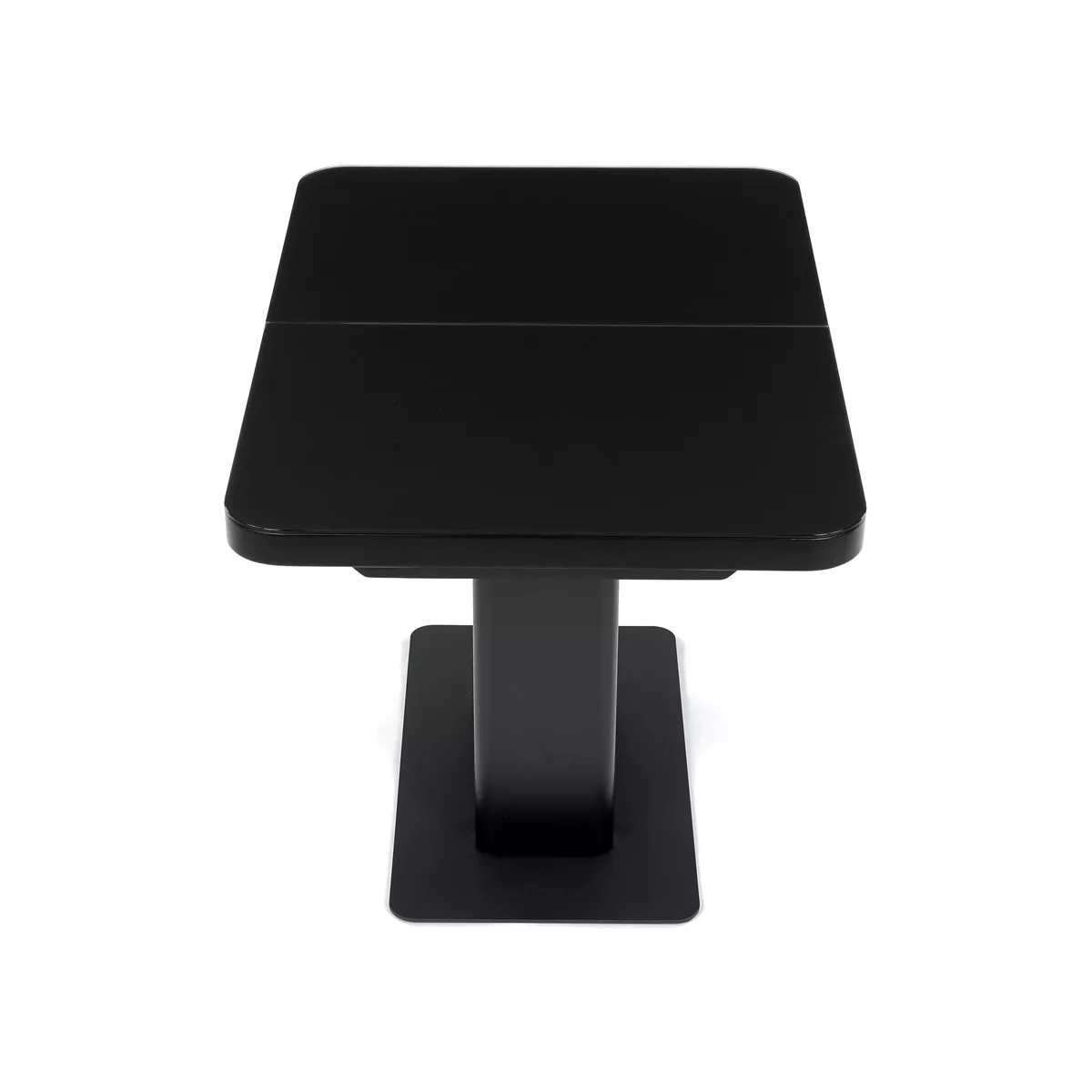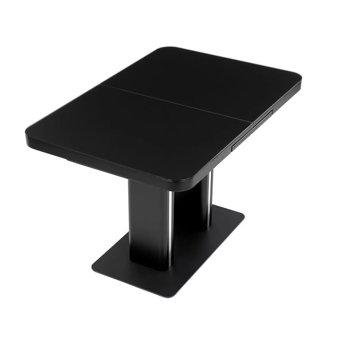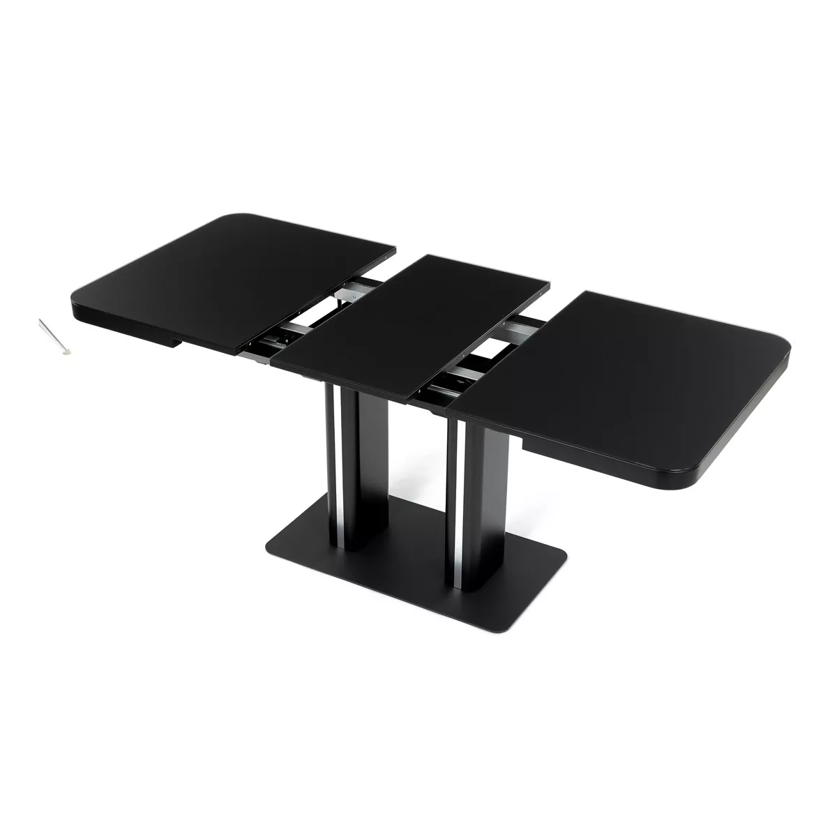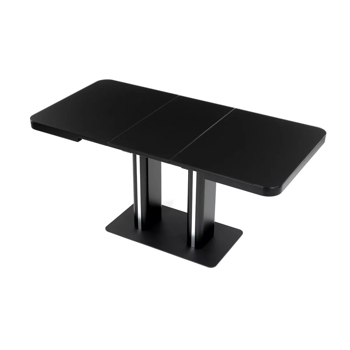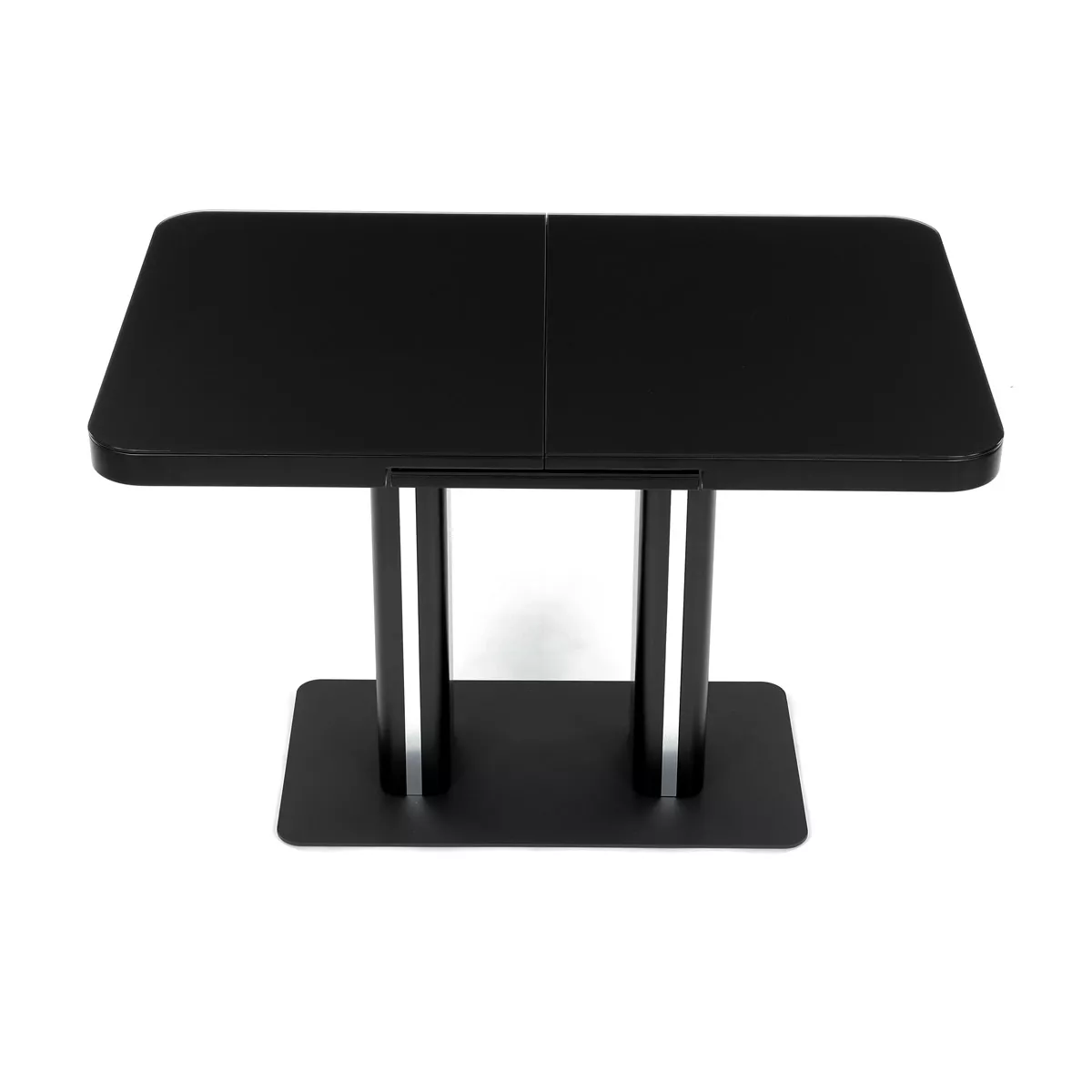 Deska je vyrobena z tvrzeného černého skla, které je vysoce odolné proti poškrábání a snadno se udržuje. Stabilní konstrukce z MDF materiálu s černým matným lakem dodává stolu pevnost i elegantní vzhled. Zaoblené rohy zvyšují bezpečnost při používání a podtrhují moderní charakter stolu. Robustní centrální podnož s dvojitými sloupky a podstavcem zajišťuje rovnoměrné rozložení hmotnosti a stabilitu při každodenním používání.