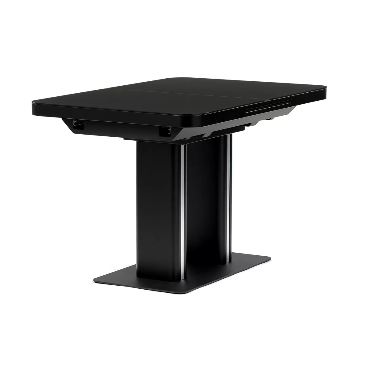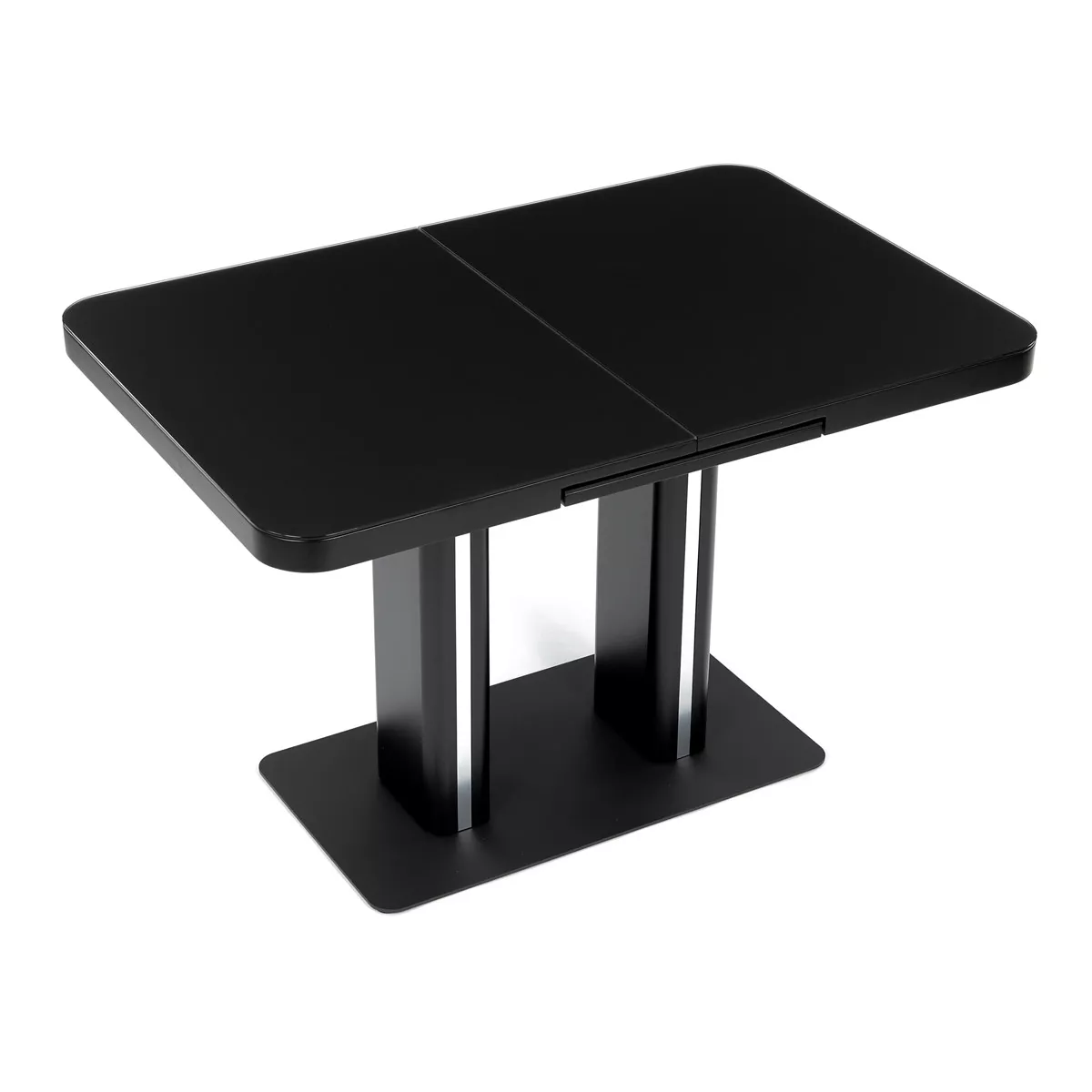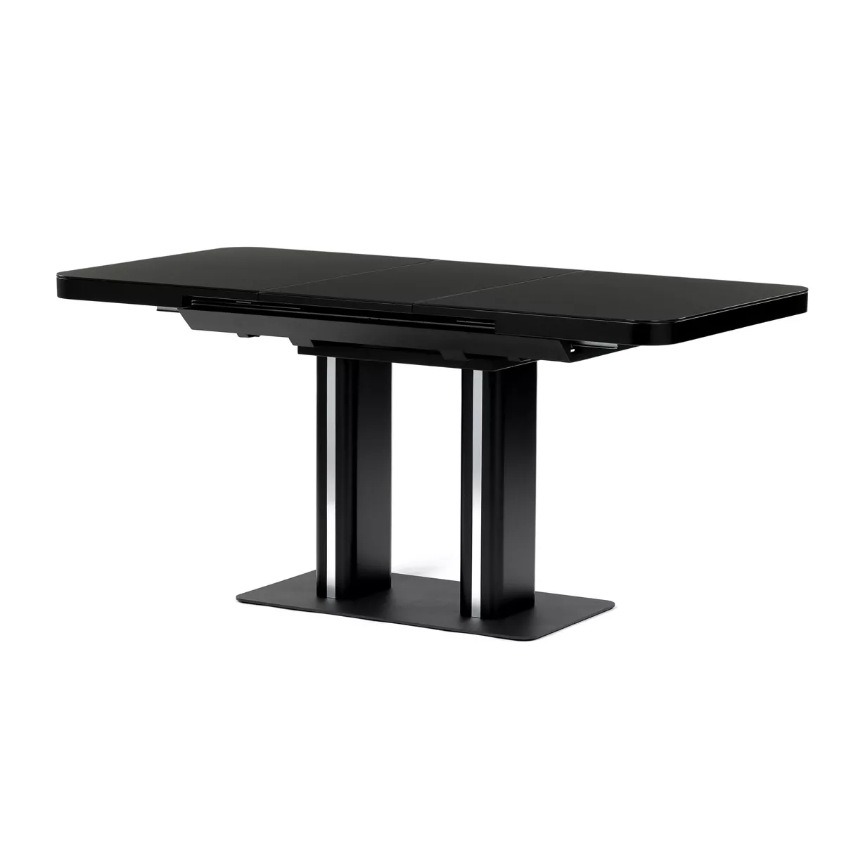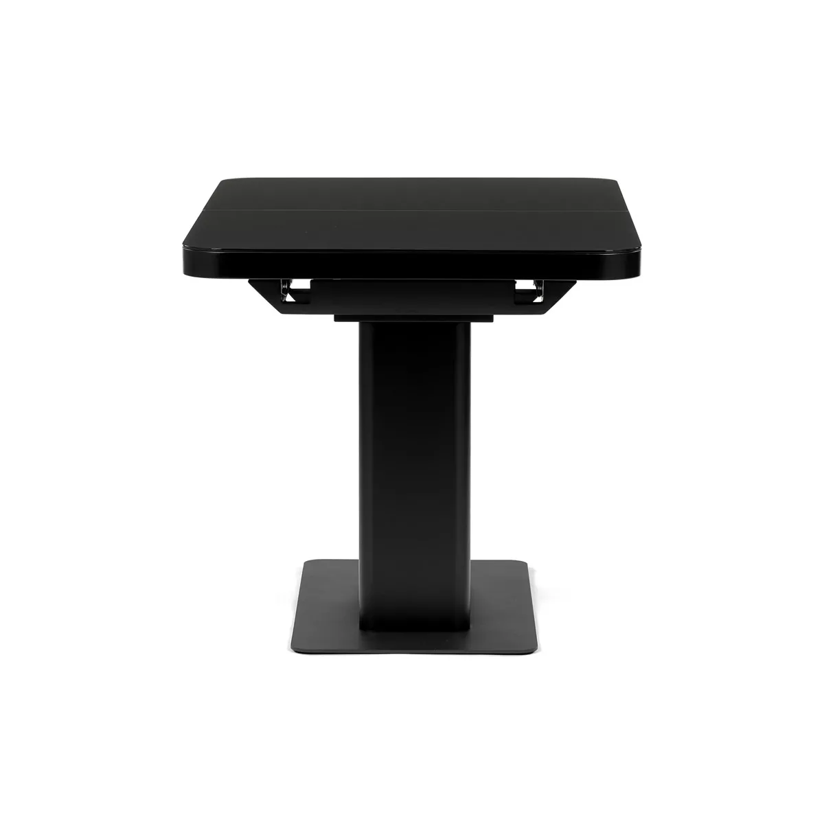 Deska je vyrobena z tvrzeného černého skla, které je vysoce odolné proti poškrábání a snadno se udržuje. Stabilní konstrukce z MDF materiálu s černým matným lakem dodává stolu pevnost i elegantní vzhled. Zaoblené rohy zvyšují bezpečnost při používání a podtrhují moderní charakter stolu. Robustní centrální podnož s dvojitými sloupky a podstavcem zajišťuje rovnoměrné rozložení hmotnosti a stabilitu při každodenním používání.