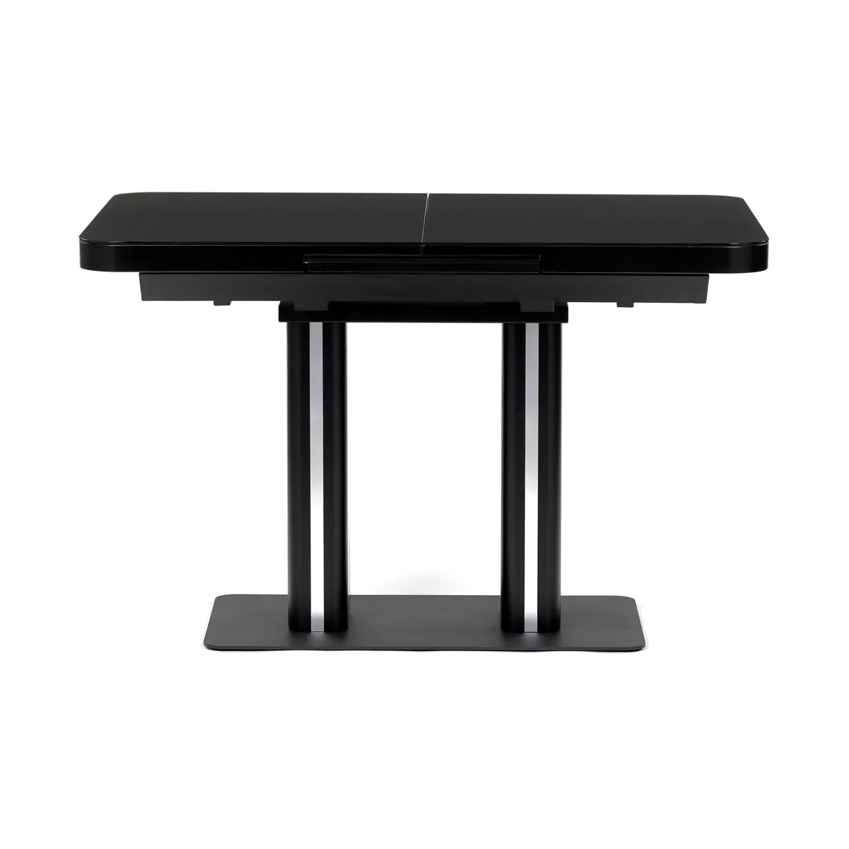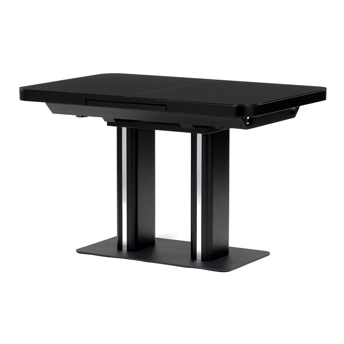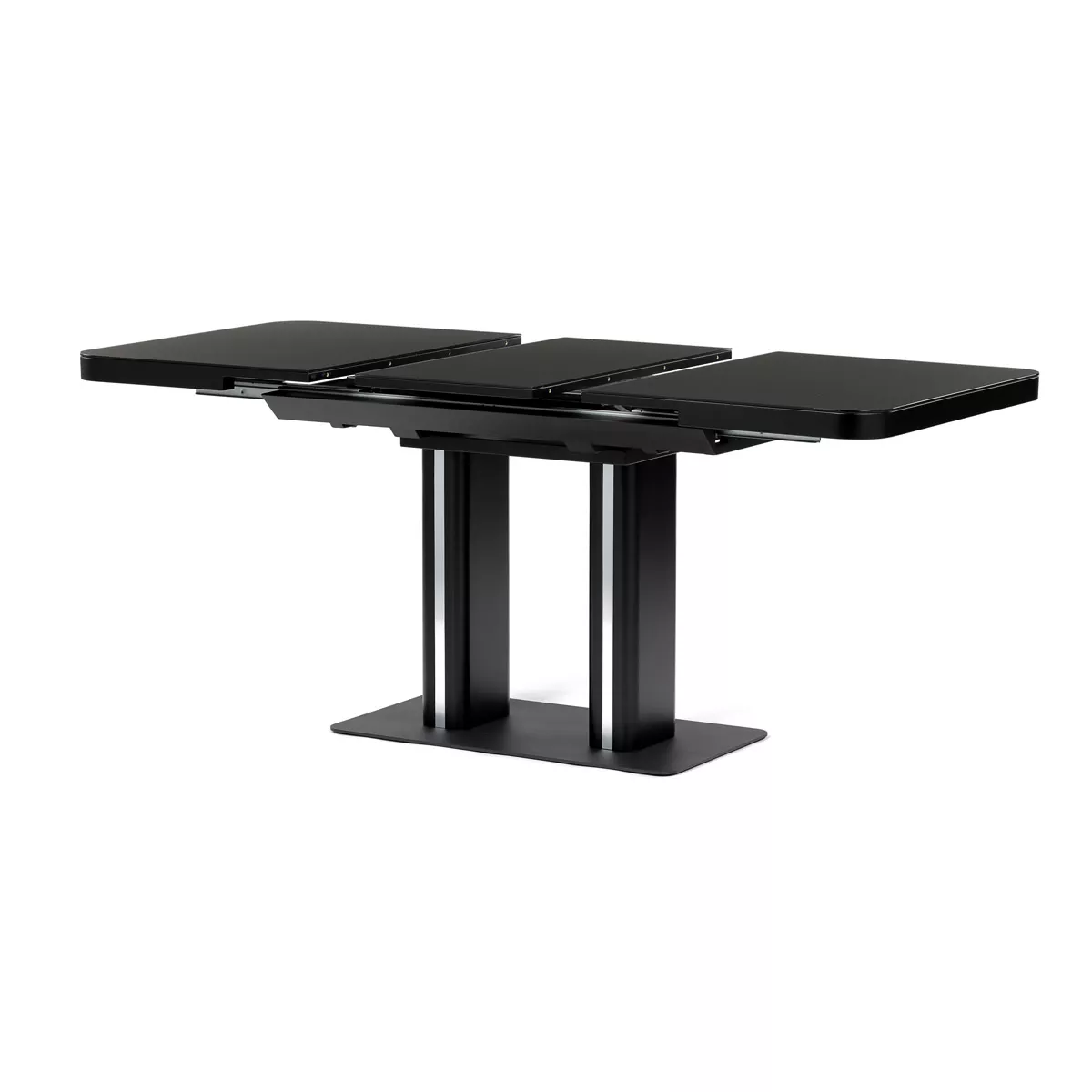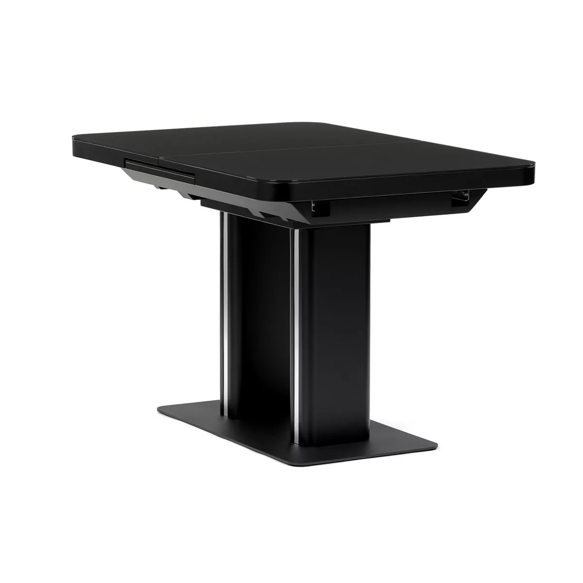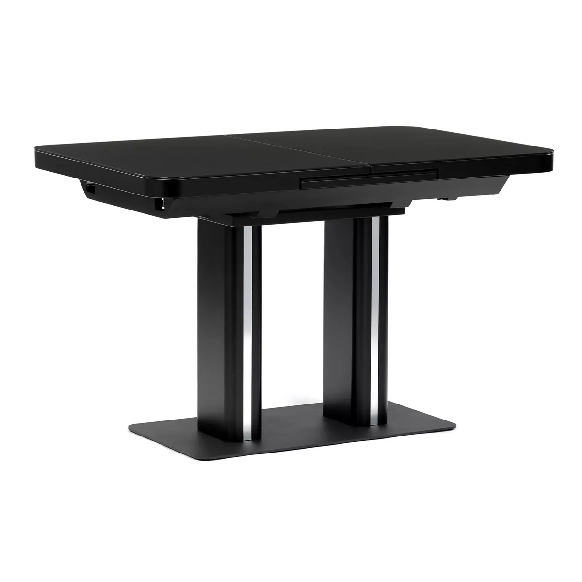Deska je vyrobena z tvrzeného černého skla, které je vysoce odolné proti poškrábání a snadno se udržuje. Stabilní konstrukce z MDF materiálu s černým matným lakem dodává stolu pevnost i elegantní vzhled. Zaoblené rohy zvyšují bezpečnost při používání a podtrhují moderní charakter stolu. Robustní centrální podnož s dvojitými sloupky a podstavcem zajišťuje rovnoměrné rozložení hmotnosti a stabilitu při každodenním používání.
