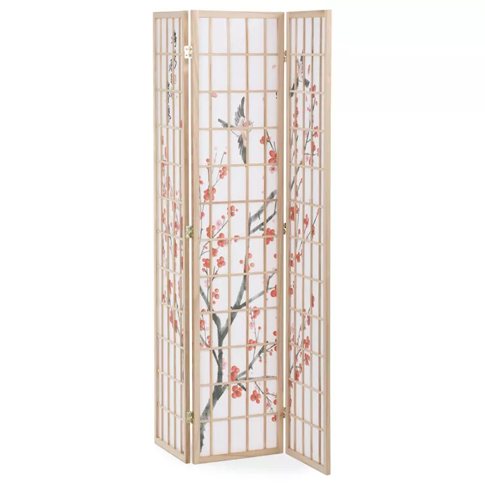 Třípanelový paraván z masivního smrkového dřeva v přírodním odstínu přináší do interiéru jemnost, světlo a harmonii. Kombinuje pevnou dřevěnou konstrukci s bílou netkanou textilií, kterou zdobí decentní motiv větví, květů a ptáků v černých a červených tónech. Tento design dodává paravánu přírodní a zároveň umělecký vzhled, díky kterému se stane dekorativním prvkem každého interiéru.