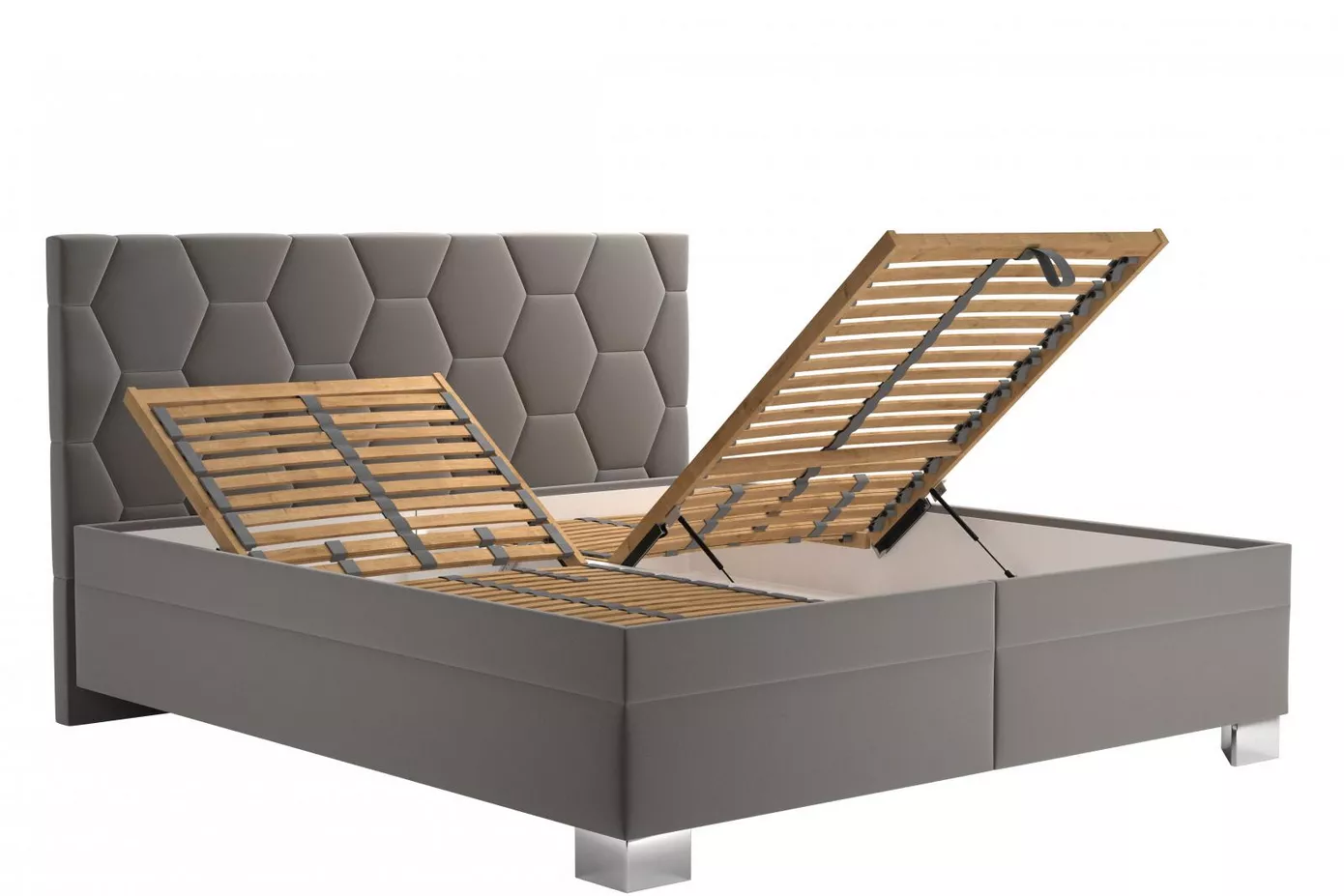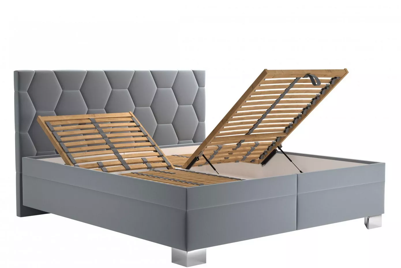Součástí postele jsou lamelové rošty s pístovým mechanismem, které umožňují snadné zvedání a přístup k velkému úložnému prostoru. Rošty mají 28 lamel s možností nastavení tuhosti, mechanické polohování hlavy i nohou a popruh proti přetížení. Díky tomu si můžete přizpůsobit polohu i komfort podle svých potřeb.