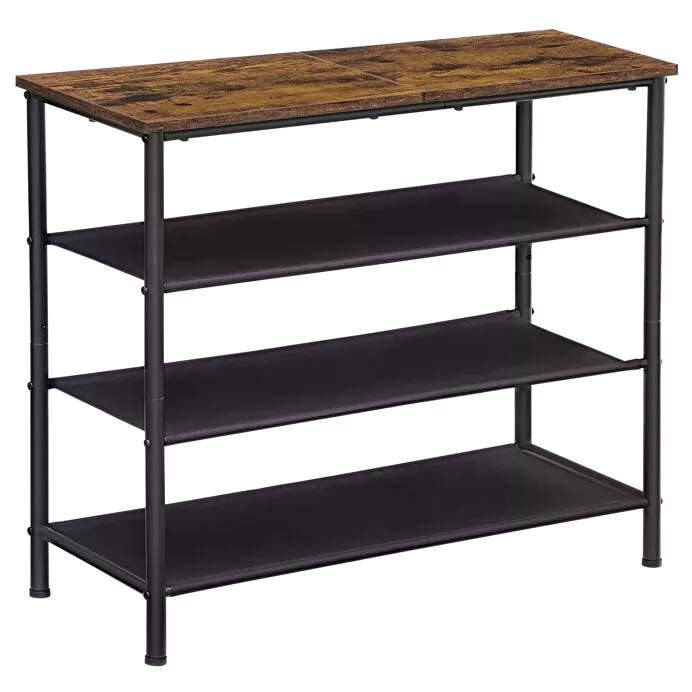 Součástí jsou tři prostorné police potažené odolnou polyesterovou tkaninou, které poskytují dostatek místa pro uložení obuvi, tašek nebo drobných doplňků. Kovové nohy jsou opatřeny plastovými kluzáky, které chrání podlahu před poškozením a zajišťují bezpečnou stabilitu.