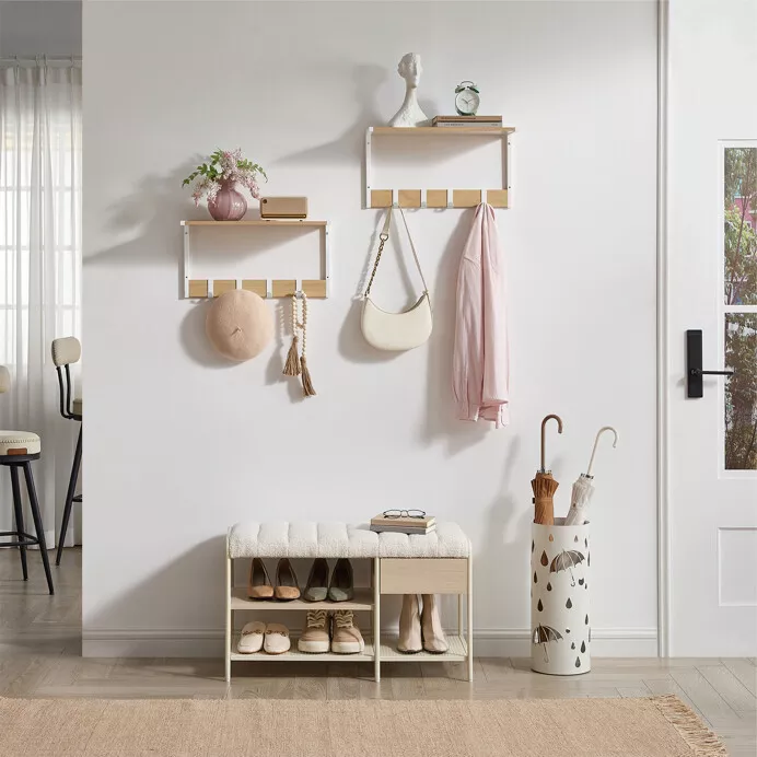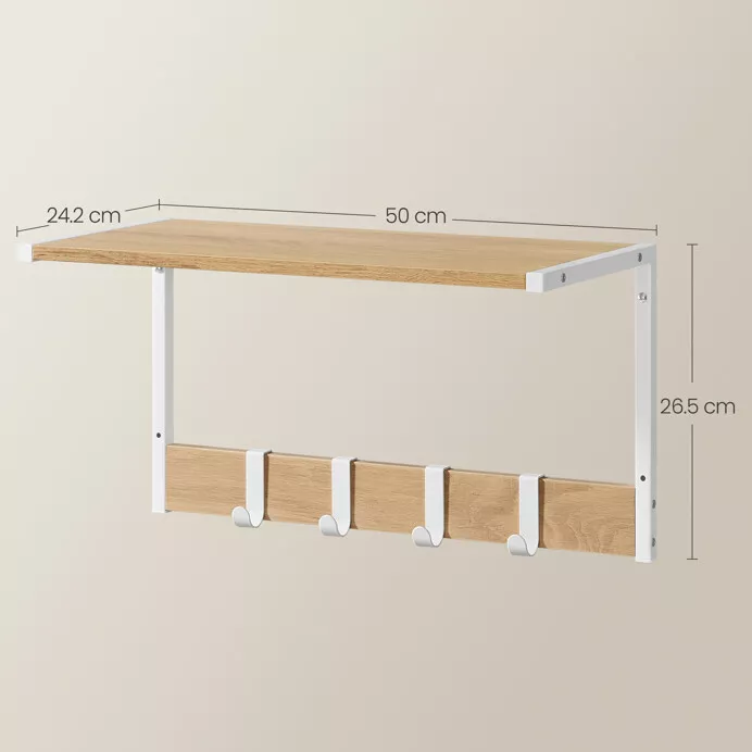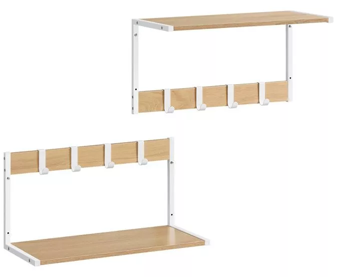 Tato sada dvou nástěnných polic kombinuje MDF desky v dekoru dubového dřeva s pevnými kovovými vzpěrami v černé barvě, které zajišťují stabilitu, odolnost a dlouhou životnost. Každá police nabízí praktický odkládací prostor doplněný o čtyři kovové háčky, vhodné pro zavěšení klíčů, drobných doplňků, kuchyňského náčiní či dekorací.