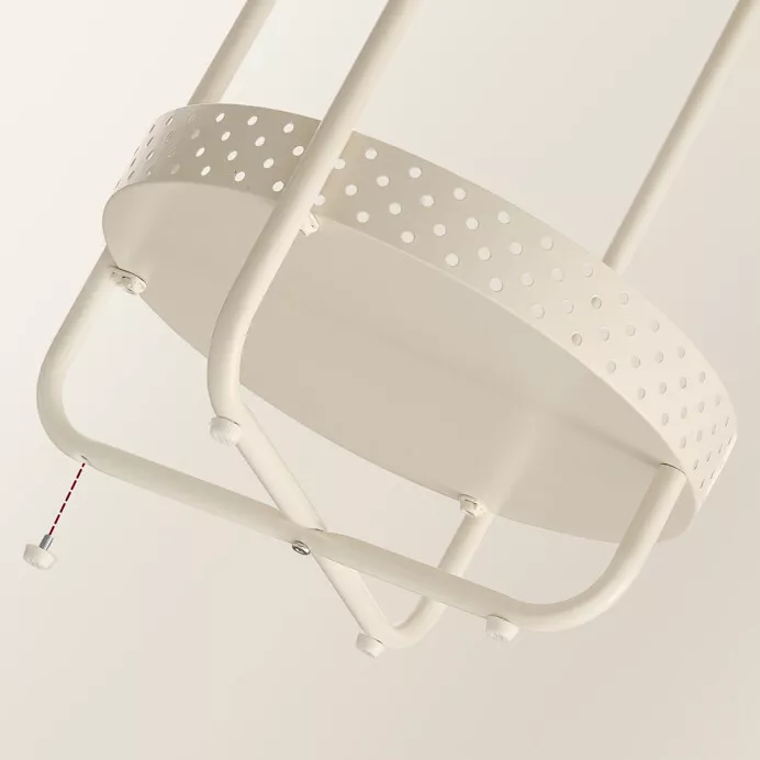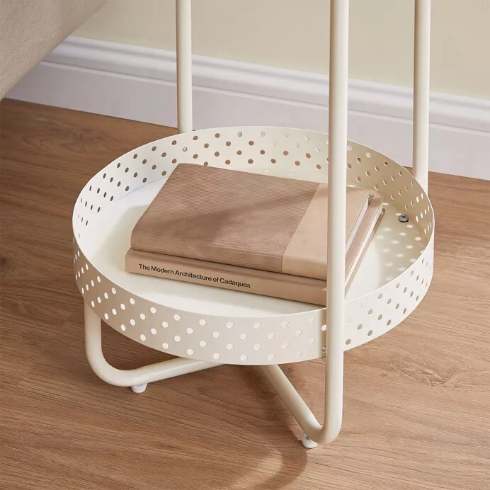 Součástí stolku je spodní odkládací prostor s perforovaným kovovým okrajem, který poskytuje další místo pro uložení knih, časopisů nebo drobných dekorací. Kovové nohy jsou vybaveny rektifikačními patkami, které umožňují vyrovnání stolku i na nerovném povrchu.
