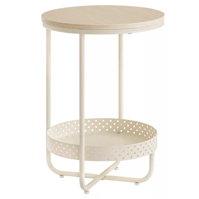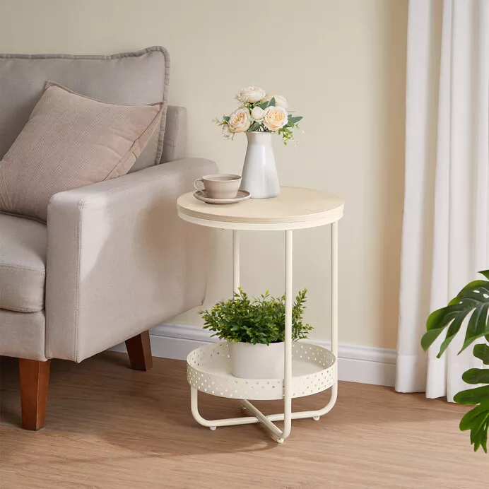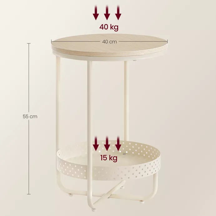 Elegantní odkládací stolek s kulatou deskou o průměru 40 cm spojuje přírodní vzhled dřeva s čistotou kovové konstrukce. Deska z MDF v dekoru běleného dubu má matnou povrchovou úpravu, která je příjemná na dotek, odolná vůči poškození a snadno se čistí. Pevná kovová konstrukce v béžovém odstínu dodává stolku stabilitu a lehkost.