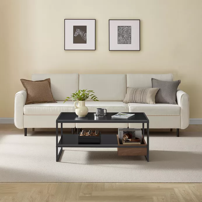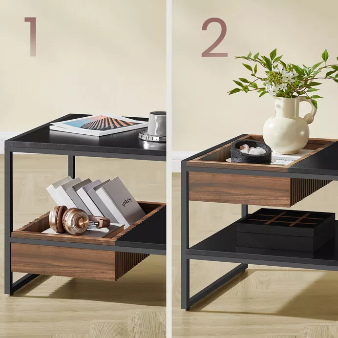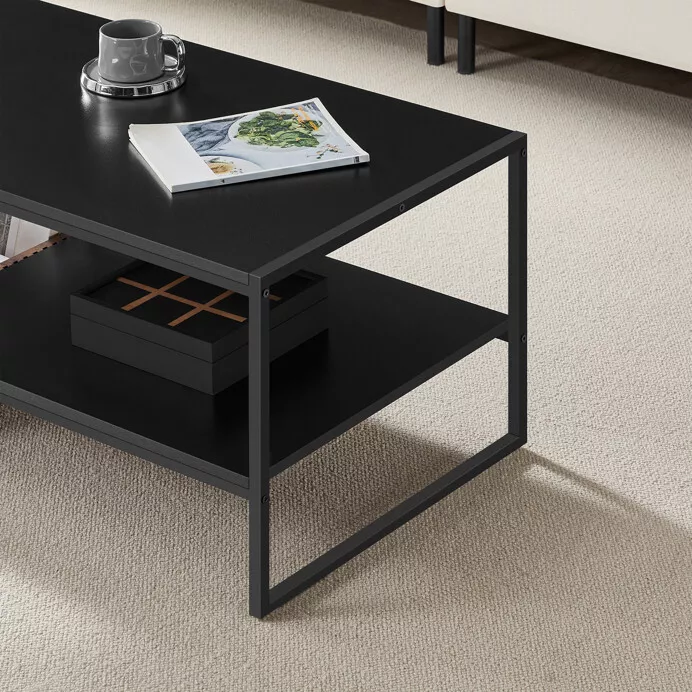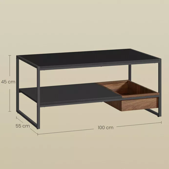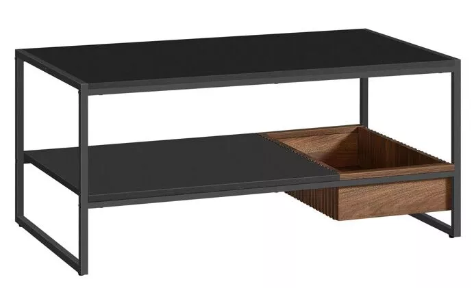 Elegantní konferenční stolek o rozměrech 100 × 55 × 45 cm zaujme kombinací matné černé konstrukce a desky z MDF v dekoru přírodního ořechu. Spojení kovu a dřeva vytváří harmonický kontrast, který zapadne do každého moderního či industriálního interiéru.