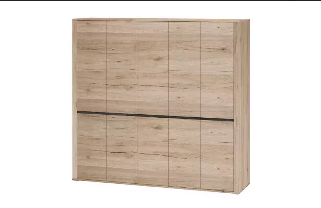 Skříň disponuje 5 dvířky, 9 policemi a 2 šatními tyčemi, které poskytují dostatek prostoru pro oděvy, prádlo i sezónní věci.