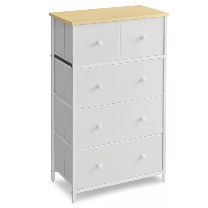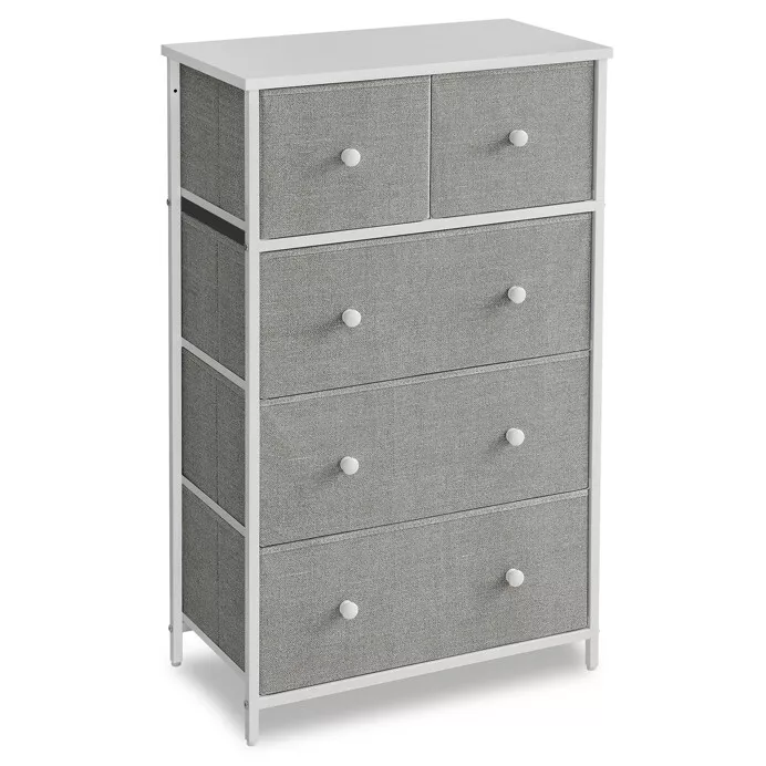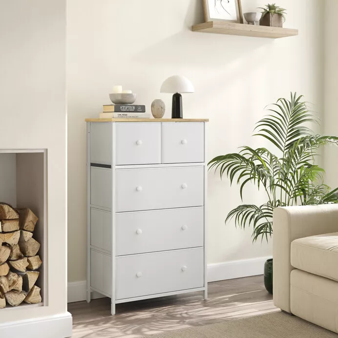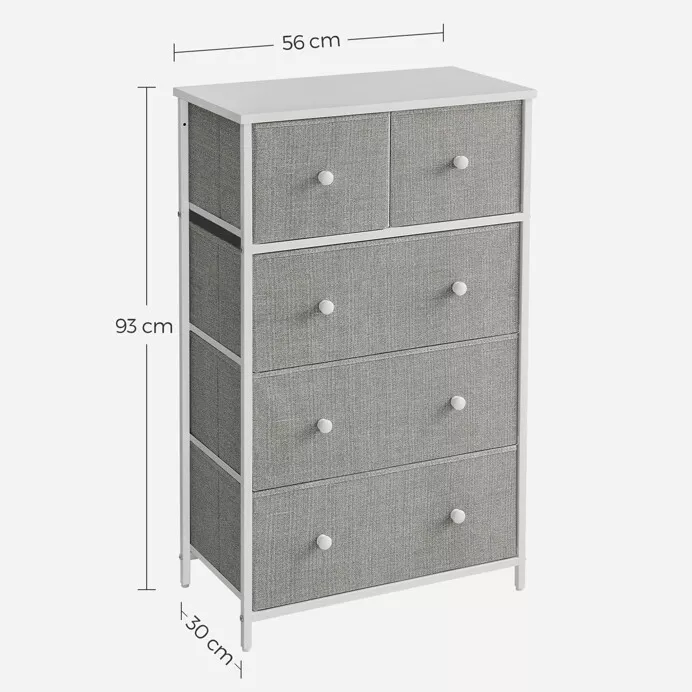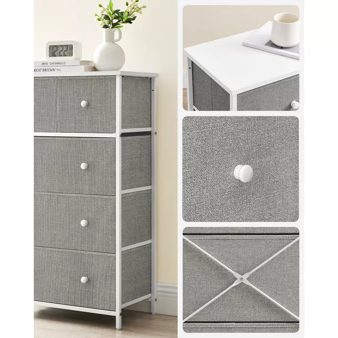 Čtyři prostorné zásuvky z netkané textilie v šedém odstínu nabízejí dostatek úložného prostoru pro oblečení, doplňky nebo drobnosti. Kulaté úchytky usnadňují manipulaci, zatímco kovové nohy zajišťují stabilitu a dlouhou životnost.