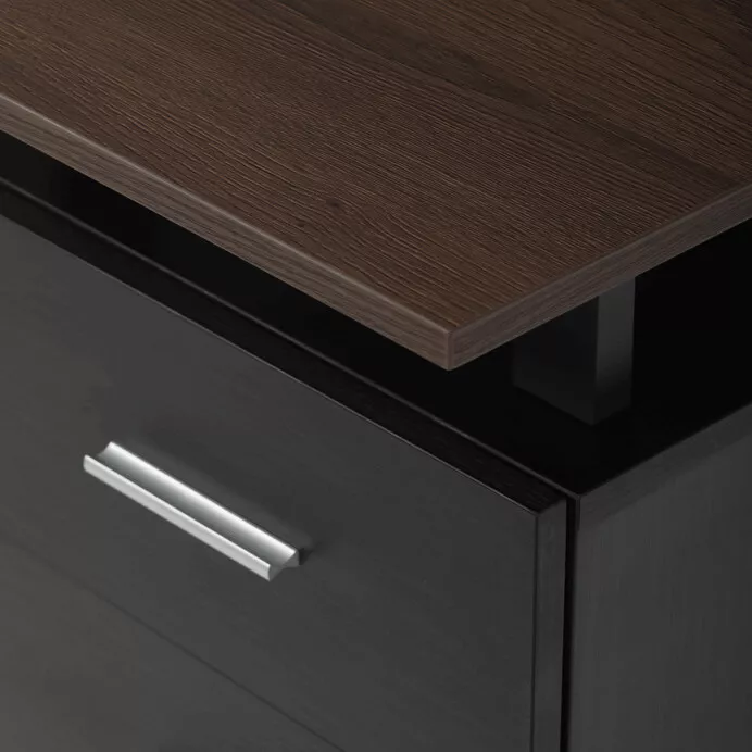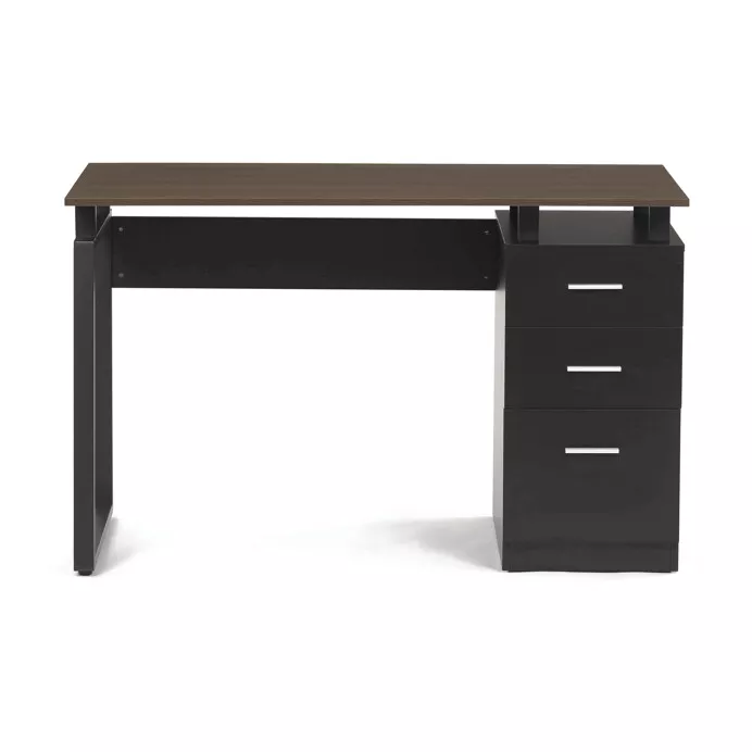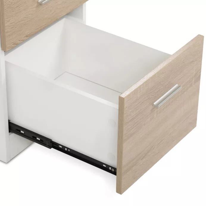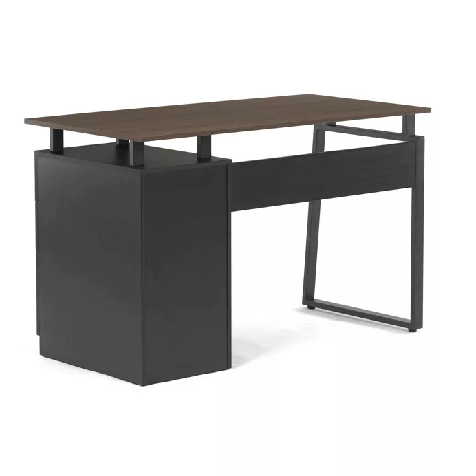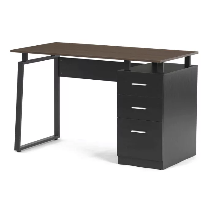Stůl je vybaven třemi prostornými zásuvkami s kovovými úchytkami, které poskytují dostatek místa pro organizaci dokumentů či kancelářských doplňků. Kovová podnož zajišťuje vynikající stabilitu a dlouhou životnost, zatímco kombinace přírodního dekoru dřeva a černých detailů působí moderně a elegantně.