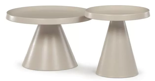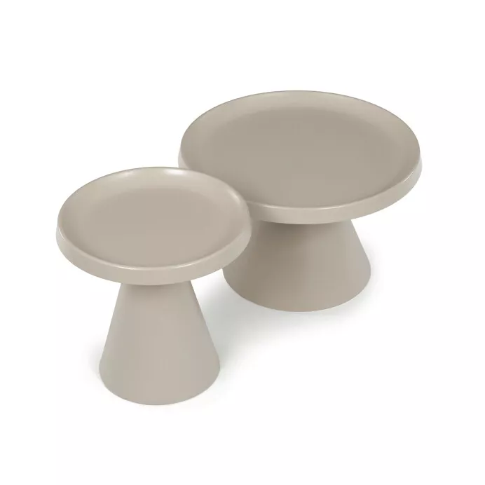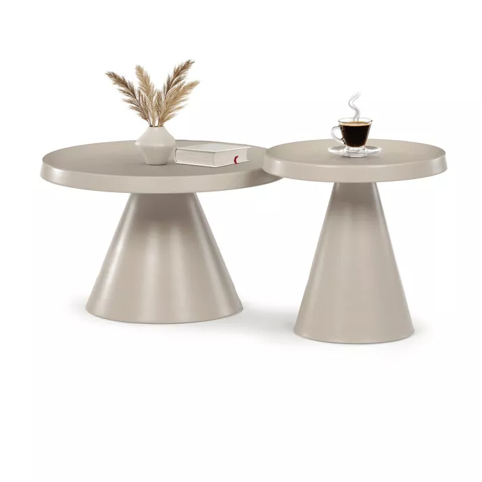 Větí stolek má průměr 68,5 cm a výku 43,5 cm, zatímco mení disponuje průměrem 49 cm a výkou 49,5 cm, díky čemu lze oba stolky snadno variabilně uspořádat podle potřeby. Decentní dekorativní hrany a jednoduchá centrální podno podtrhují čistý a minimalistický vzhled celé sady.