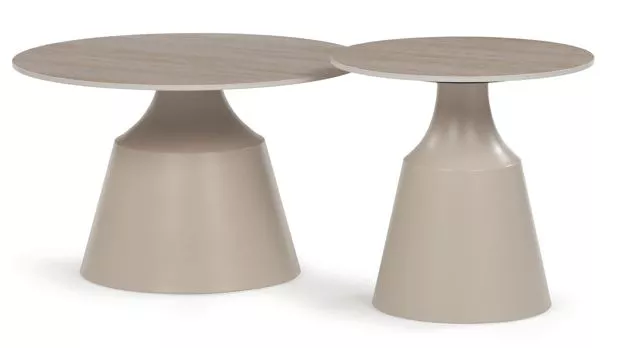 Větí stolek s průměrem 70 cm a výkou 43,5 cm doplňuje mení o průměru 50 cm a výce 48,5 cm, díky čemu lze stolky variabilně kombinovat nebo částečně zasouvat. Pevná kovová podno v odpovídající béové barvě zajiuje stabilitu a dlouhou ivotnost, a zároveň podtrhuje celkový moderní vzhled.