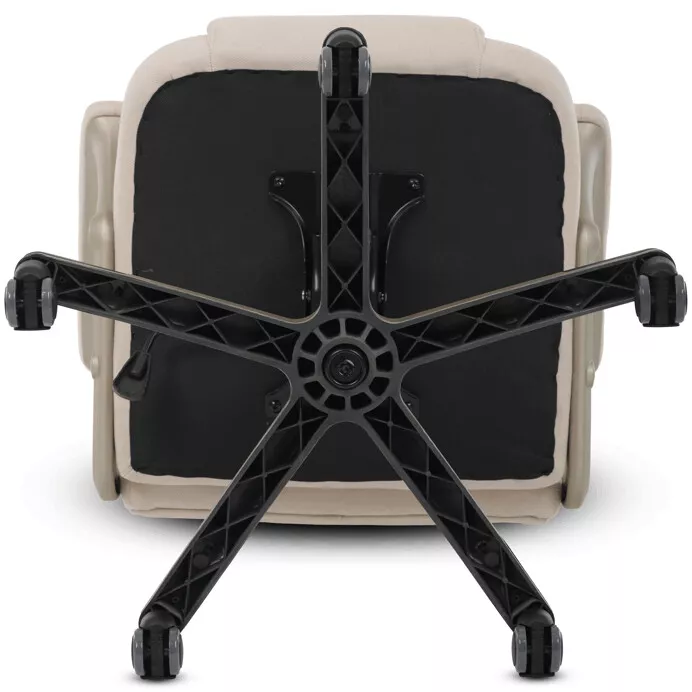Stabilitu zaručuje plastová základna v odstínu champagne, která je osazena kolečky pro tvrdé podlahy - ta zajišťují plynulý pohyb bez poškození povrchu. Křeslo kombinuje jemný vzhled s praktickými funkcemi, takže zaujme nejen svým designem, ale i pohodlím při každodenním používání.