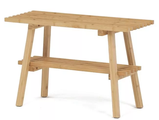 Stabilní nohy mírně rozšířené do stran zajišťují pevnost a bezpečné používání, zatímco hladce opracovaný bambusový povrch usnadňuje údržbu a zvýrazňuje přirozenou kresbu dřeva. Díky svým kompaktním rozměrům se botník snadno vejde i do menších předsíní nebo chodeb, kde nabízí přehledné a stylové uspořádání obuvi.