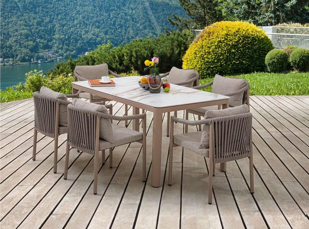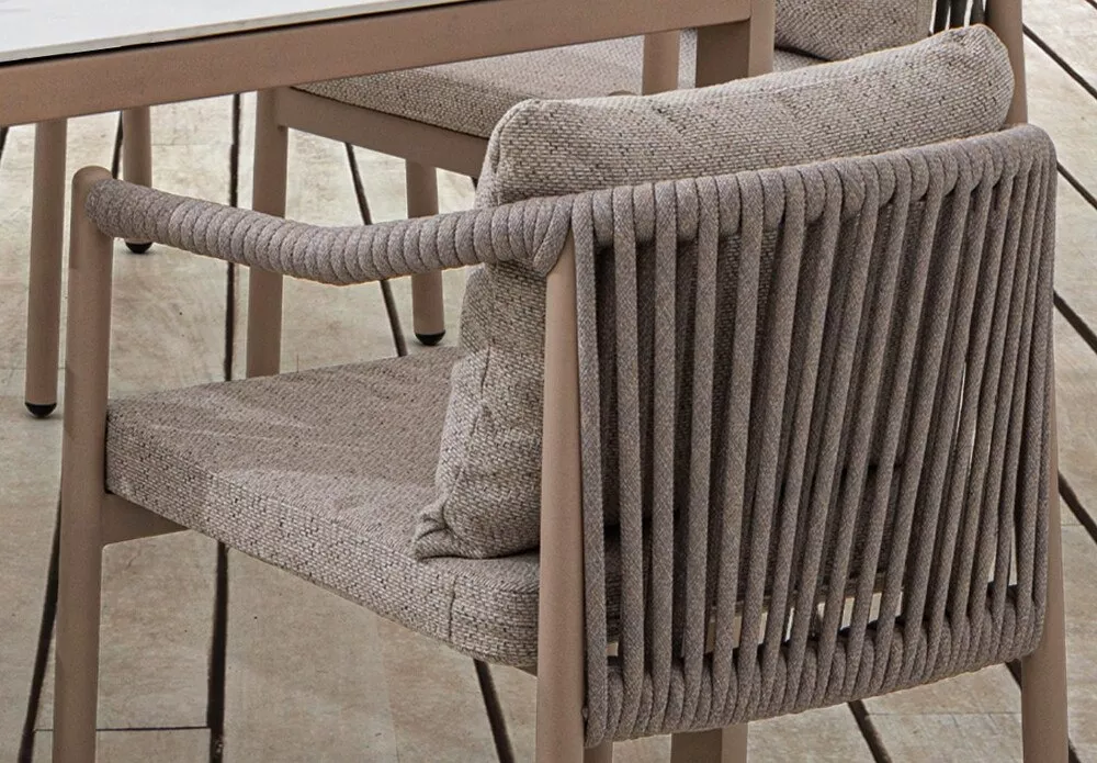 BOISE - jídelní hliníková souprava CAPPUCCINO kombinuje elegantní design, kvalitní materiály a maximální praktičnost. Hliníková konstrukce v moderním cappuccino odstínu je doplněna o atraktivní lankový (provázkový) výplet, který dodává sestavě lehkost a stylový vzhled. Díky vysoké odolnosti materiálů je souprava vhodná do exteriéru i interiéru - na zahrady, terasy, do zimních zahrad, ale také do recepcí či uvítacích prostor.