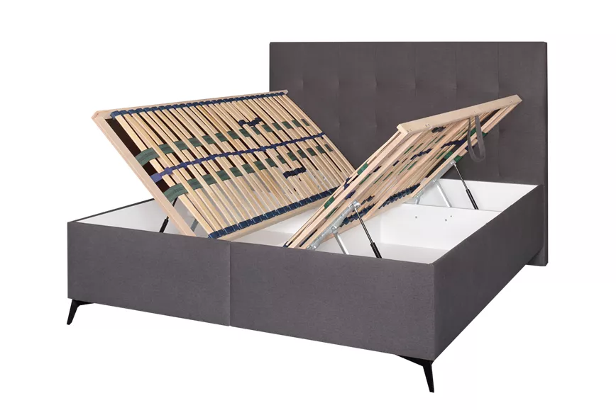 Postel Venuše představuje elegantní a praktické řešení pro moderní ložnice. Její čalouněná základna ve tvaru boxu zajišťuje pevnost, stabilitu a dlouhou životnost. Každý box je vybaven odvětrávaným úložným prostorem, který je snadno přístupný pomocí bočních výklopných roštů s plynovými vzpěrami. Tento systém umožňuje pohodlné otevírání i při každodenním používání.
