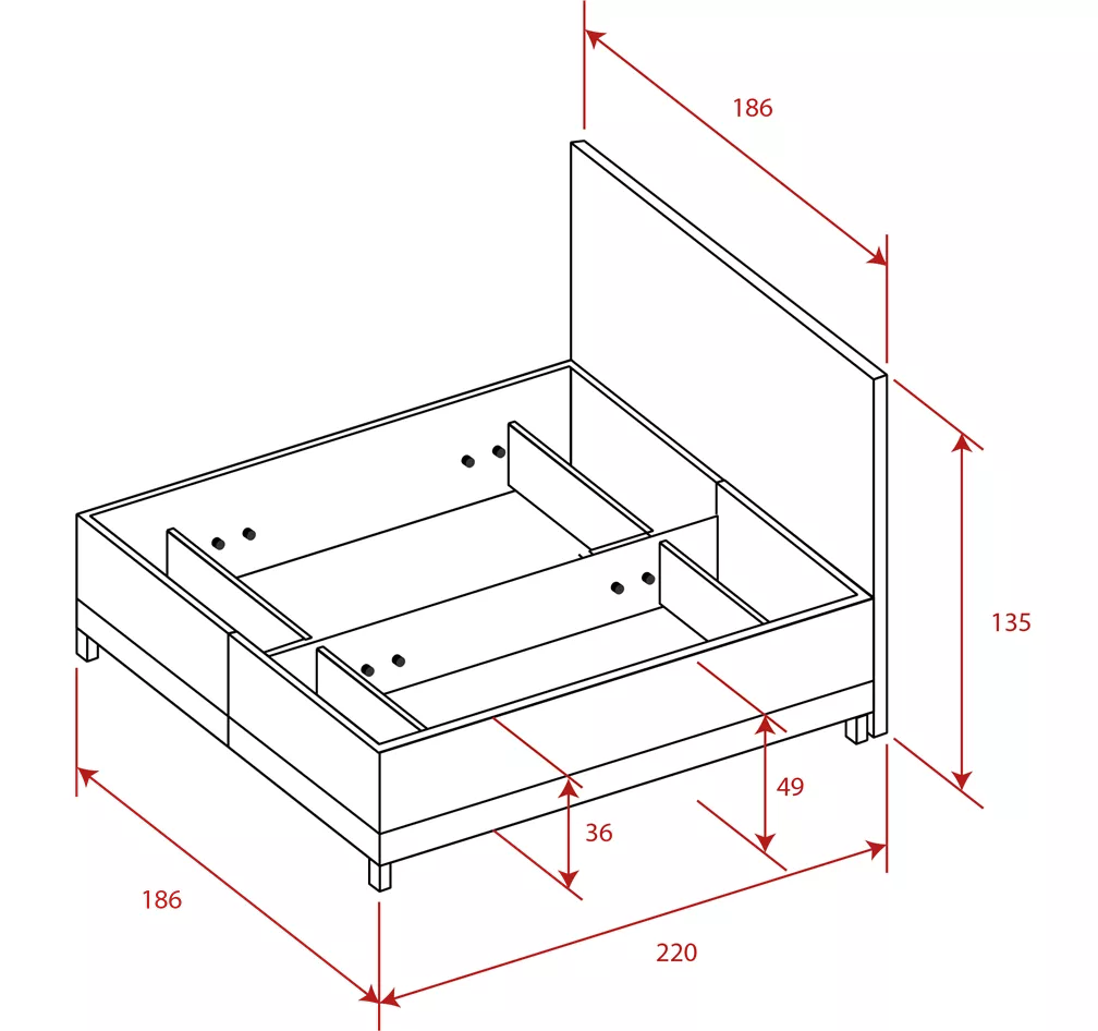 Matrace je zapuštěna cca 5 cm. Výška ložné plochy - např. s matrací o výšce 20 cm je 64 cm.Postel je určena pro libovolný typ matrace, přičemž výška matrace určuje konečnou výšku ložné plochy. Základnu doplňují dvě viditelné designové nožičky a dvě kovové spojovací nohy na vnitřní straně boxů, které zajišťují pevné spojení bez posunu.
