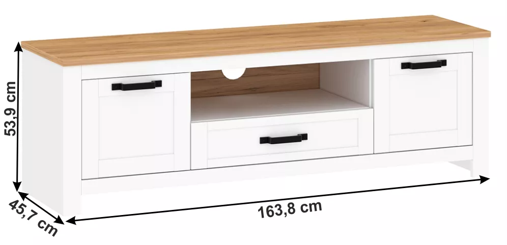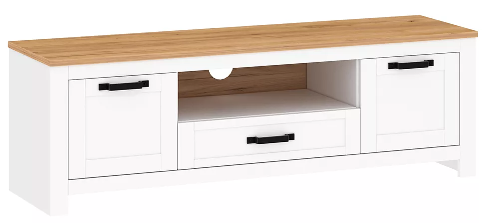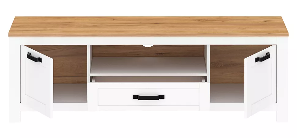 Stolek nabízí dostatek úložného prostoru pro elektroniku, příslušenství i drobnosti každodenní potřeby. Je vybaven dvěma jednodveřovými skříňkami, zásuvkou a otevřenými policemi, které umožňují přehledné uspořádání TV techniky. Ozdobné úchytky podtrhují romantický charakter nábytku a dodávají mu elegantní vzhled.