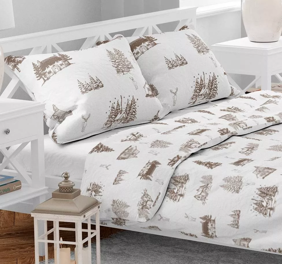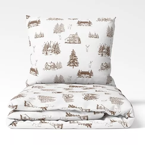Povlečení Zimní krajina doporučujeme kombinovat s prostěradly v odstínech béžové a hnědé barvy.