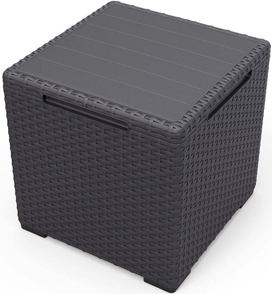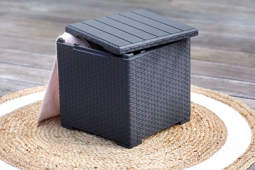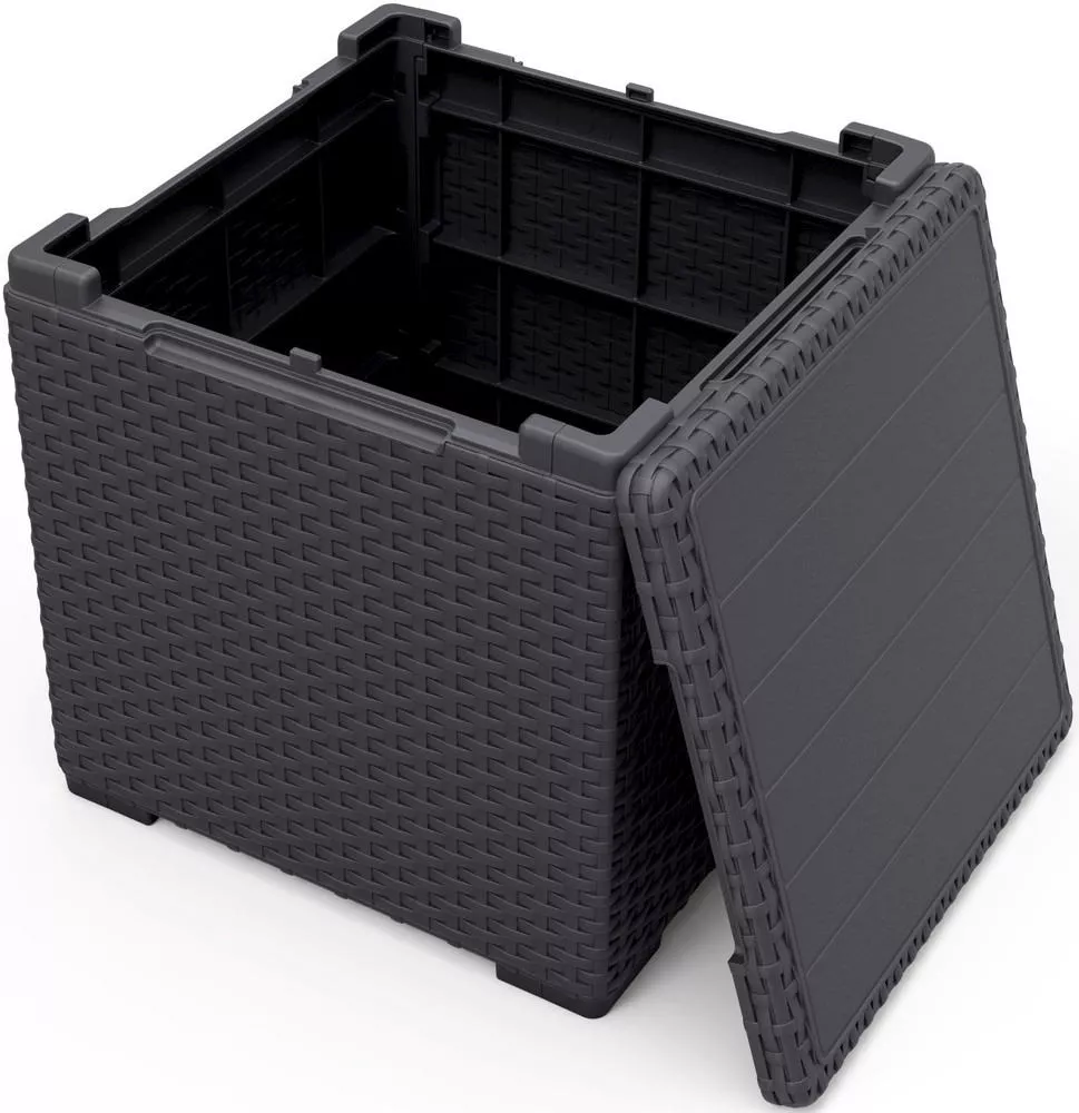 Úložný prostor je ideální pro uložení drobných zahradních doplňků, polštářů, dek, hraček nebo nápojů. Díky jednoduchému designu a grafitové barvě se stůl snadno kombinuje s dalším zahradním i bytovým nábytkem.