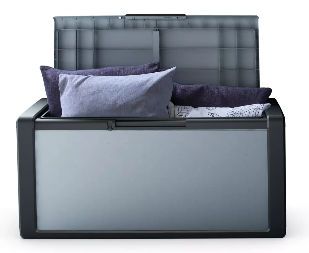 Elegantní kombinace šedé a černé barvy působí moderně a snadno se sladí s ostatním zahradním nábytkem. Praktické boční úchyty usnadňují manipulaci a box je možné uzamknout visacím zámkem (není součástí balení), což zvyšuje bezpečnost uloženého obsahu.