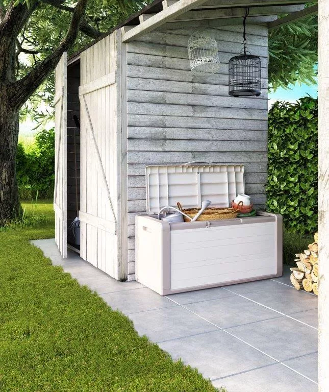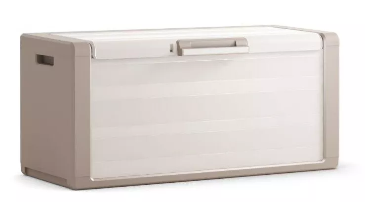 Elegantní béžové provedení působí přirozeně a snadno se kombinuje s ostatním zahradním nábytkem. Praktické boční úchyty usnadňují manipulaci a box je možné uzamknout visacím zámkem (není součástí balení) pro vyšší zabezpečení uložených věcí.