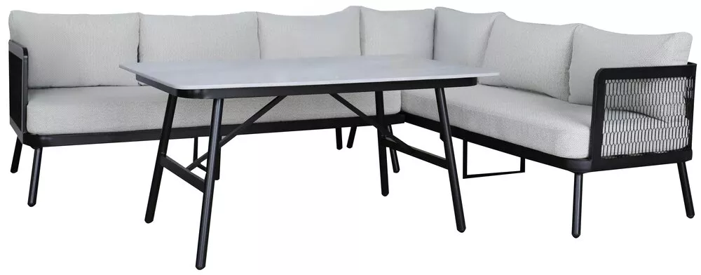 Moderní hliníkový stůl EDINBURGH v elegantním černém provedení je ideální volbou pro ty, kteří hledají spojení designu, odolnosti a univerzálního využití. Stabilní hliníková konstrukce je doplněna stolovou deskou z hliníku a pryskyřice v kamenném dekoru, která působí luxusně a zároveň je velmi praktická na údržbu.