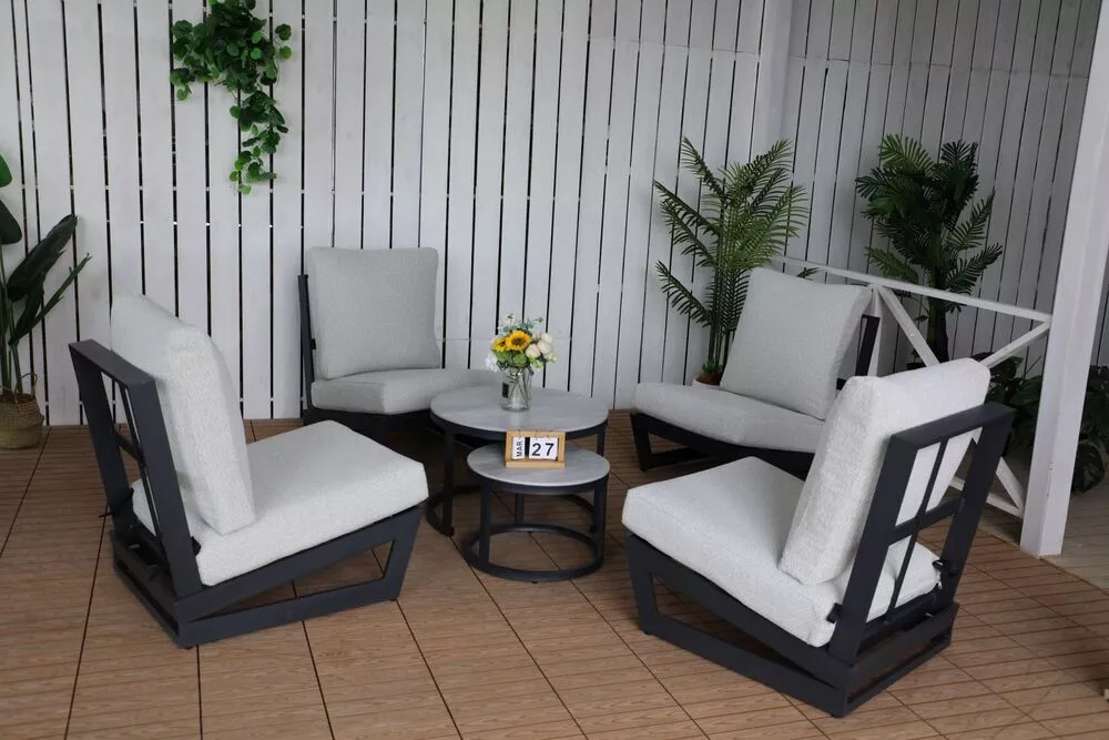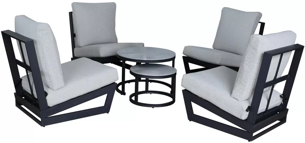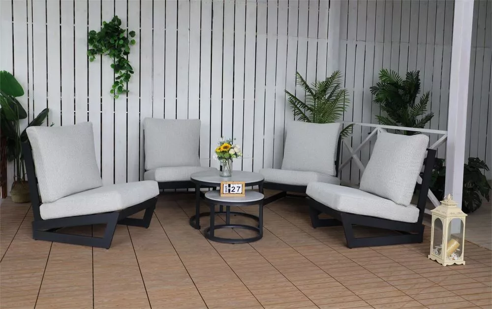 Luxusní coffee set BALI v elegantním grafitovém provedení je ideální volbou pro stylové posezení na zahradě, terase i v interiéru. Moderní hliníková konstrukce je doplněna o stolové desky z hliníku a pryskyřice v dezénu kamene, které dodávají celé sestavě nadčasový a velmi elegantní vzhled.