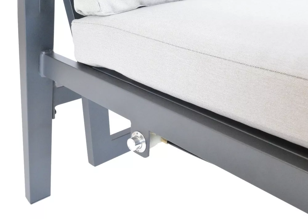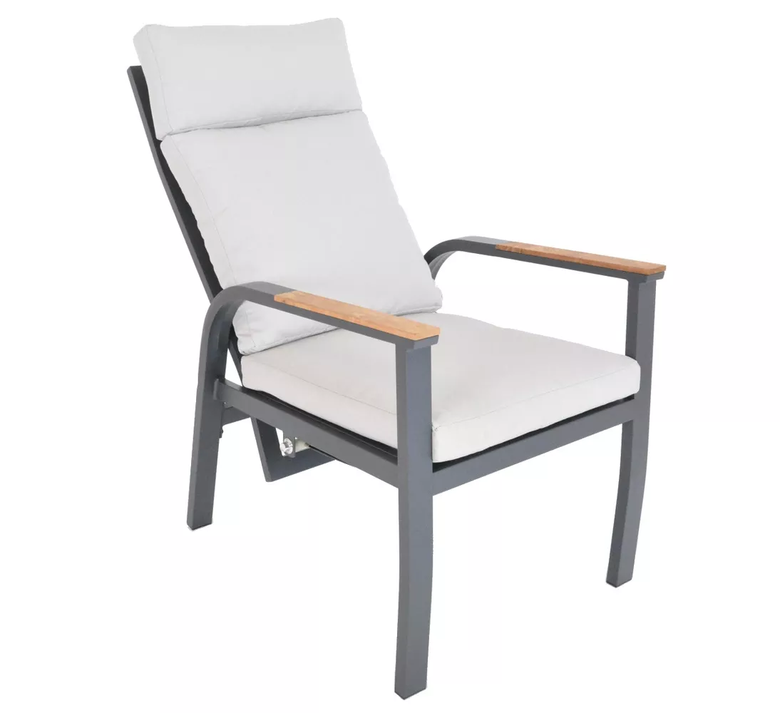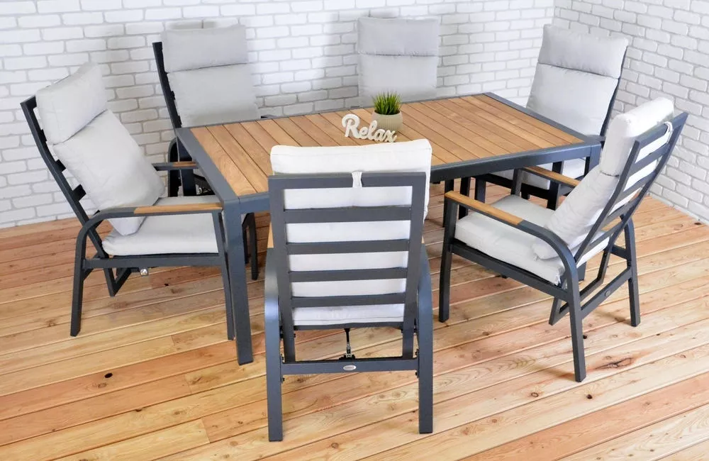 - Materiál: hliníková konstrukce, teakové područky, podušky z vodoodpudivé předené tkaniny (polyester 250 g/m²)