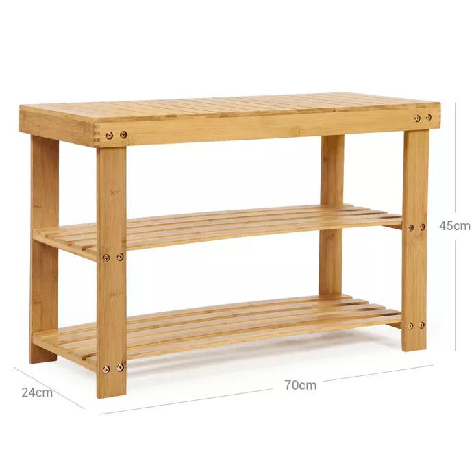 Díky kompaktním rozměrům 70 × 28 × 45 cm se botník snadno vejde i do menších prostor. Přírodní odstín bambusu působí lehce a přirozeně a dobře se kombinuje s různými styly interiéru.