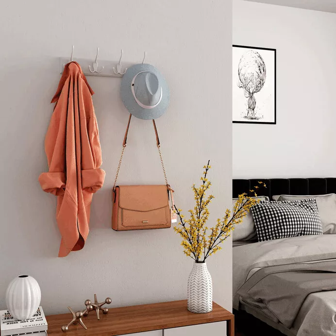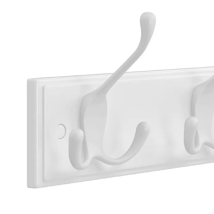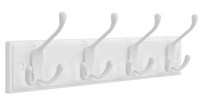 Nástěnný věšák v čistém bílém provedení nabízí čtyři pevné háčky pro praktické zavěšení kabátů, bund, tašek nebo doplňků. Je vyroben z kvalitního dřeva s hladkým povrchem, které zajišťuje příjemný vzhled i dlouhou životnost.